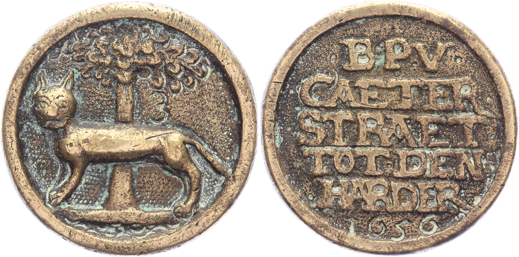 1656 Buurtpenning Katerstraat. Kater, onder boom, naar links; gegraveerd nr. 3 in veld. / Vijfregelig opschrift + gegraveerd jaartal. Messing gegoten 41,1. Dirks 20, Minard 223, vRem. 35. Zeer fraai.Ex Schulman BV, veiling 363, juni 2020, kavel 216.