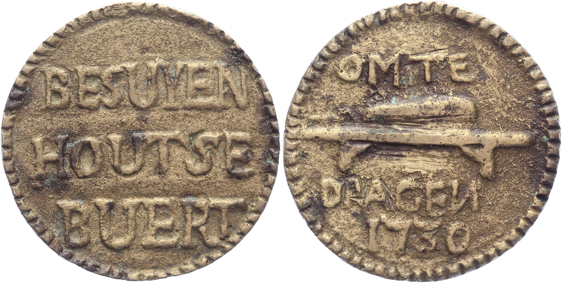 1730 Buurtpenning Bezuidenhout. Drieregelig opschrift. / Draagbaar met doodskist, weggehaald ingegraveerd nummer. Messing gegoten 50. RBN 1859.45; Minard 198; vRem. 53. Zeer fraai.Ex Schulman BV, veiling 362, maart 2020, kavel 574