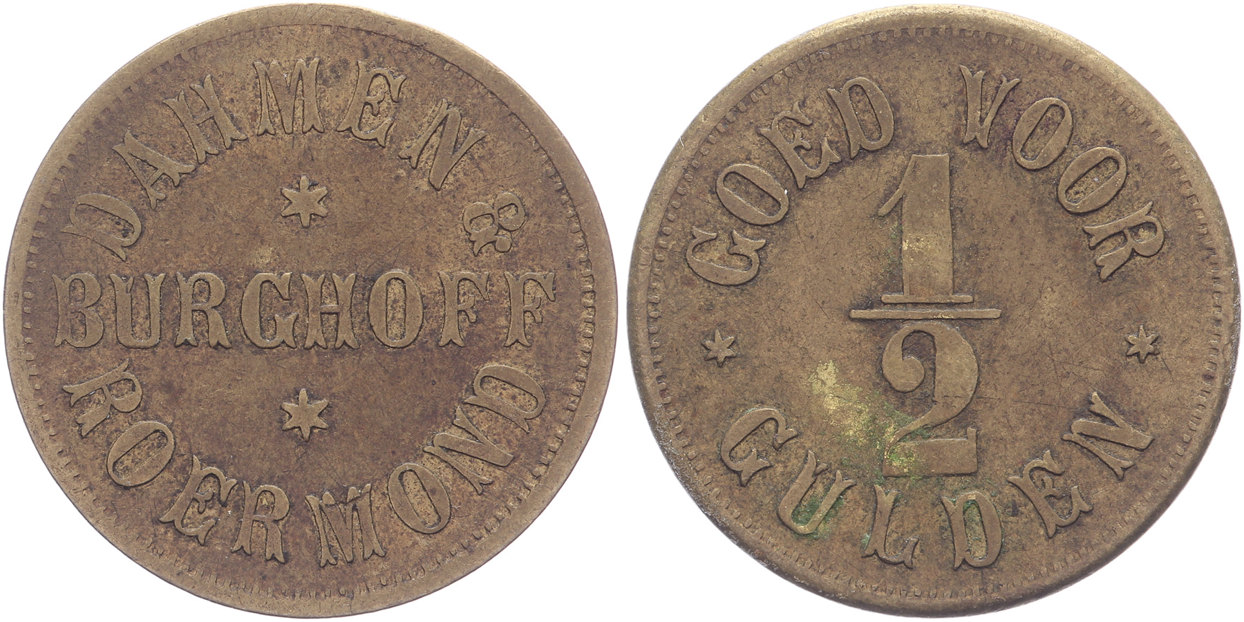 z.j. Dahmen & Burghoff, ½ gulden. Messing 23. Kooij RW-016. Zeer fraai.