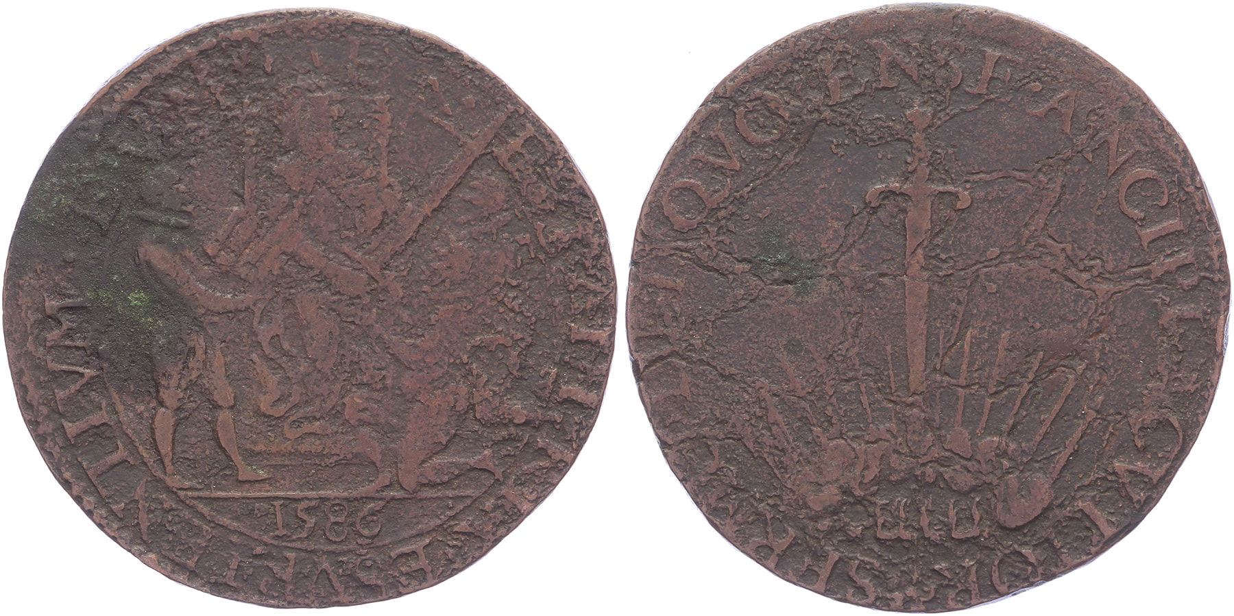 Lot (2) 1586. Dordrecht. Graaf van Leicester komt naar de Nederlanden. Verticaal zwaard beschenen door hemellicht. / Koningin Elizabeth op troon geeft hulp aan smekende Nederlanders.Æ 29. Dugn. 3096; vL I-365; Tas 228. Circa fraai.
