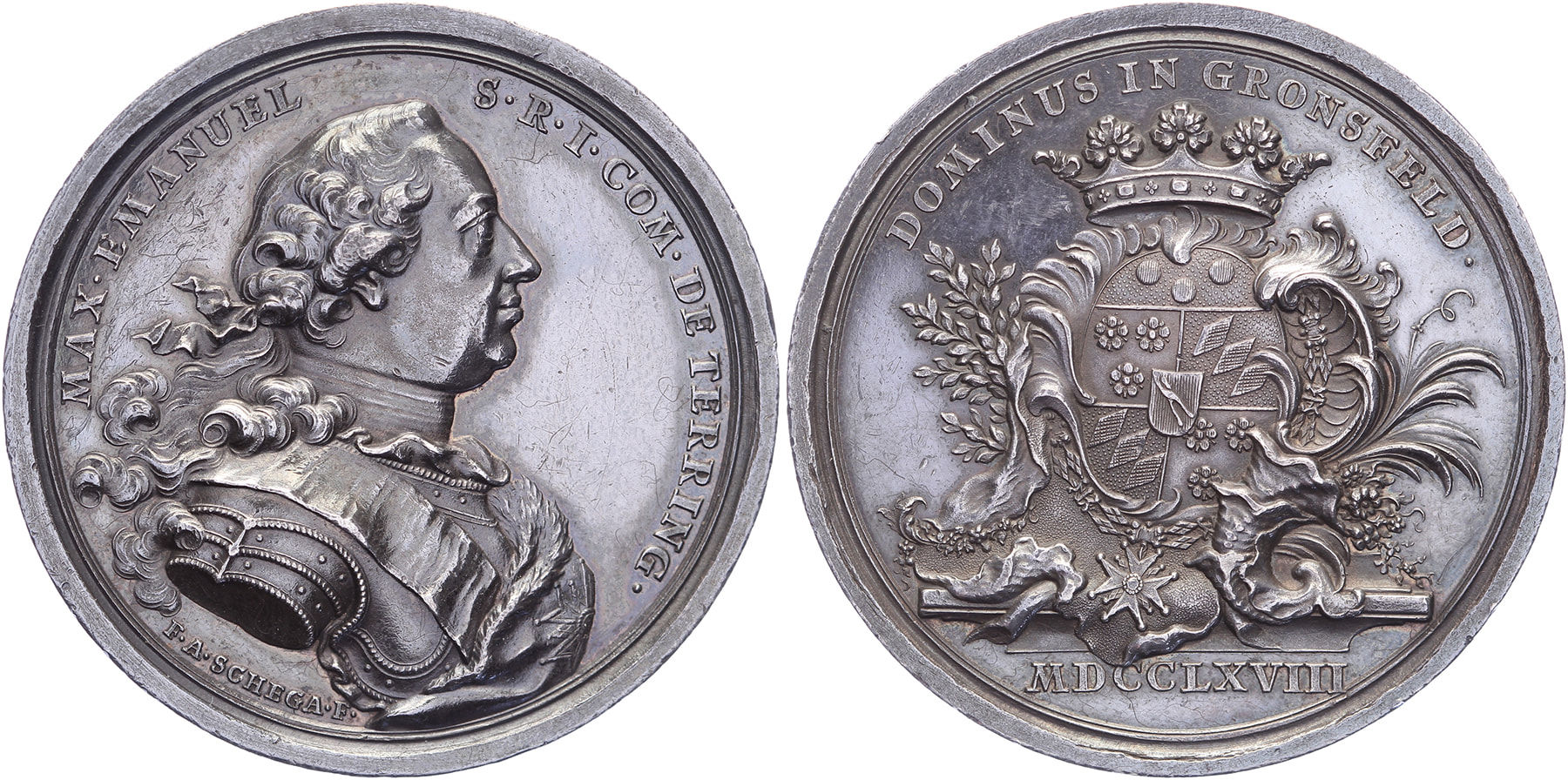 1768 Maximiliaan Emanuel, graaf van Törring-Jettenbach, heer van Gronsveld. Borstbeeld in omschrift MAX•EMANUEL - S•R•I•COM•DE•TERRING•./ Gekroond wapenschild, omhangen met de orde van St. Joris tussen bloemtakken. AR 44,41 [29,09 gram]. Van Daalen 72. Franz Andreas Schega. Prachtig.Vgl. Rijksmuseum object nr. NG-VG-1-2707; vgl veiling Künker, veiling 108, kavel 209
