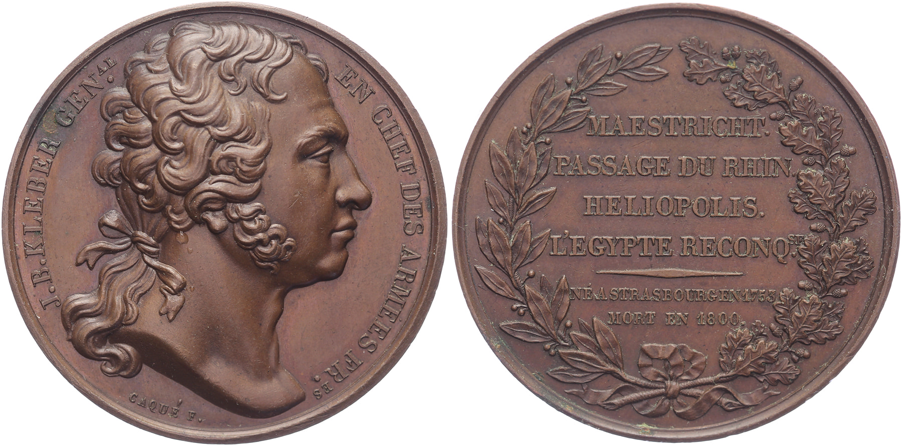 1800 Ter ere van generaal Jean-Baptiste Kléber. Buste Kléber naar rechts. / Tekst binnen eiken- en lauwerkrans van zijn prestaties (Maestricht, Passage du Rhin, etc.). Æ 40,8. A.A. Caqué. Unc.