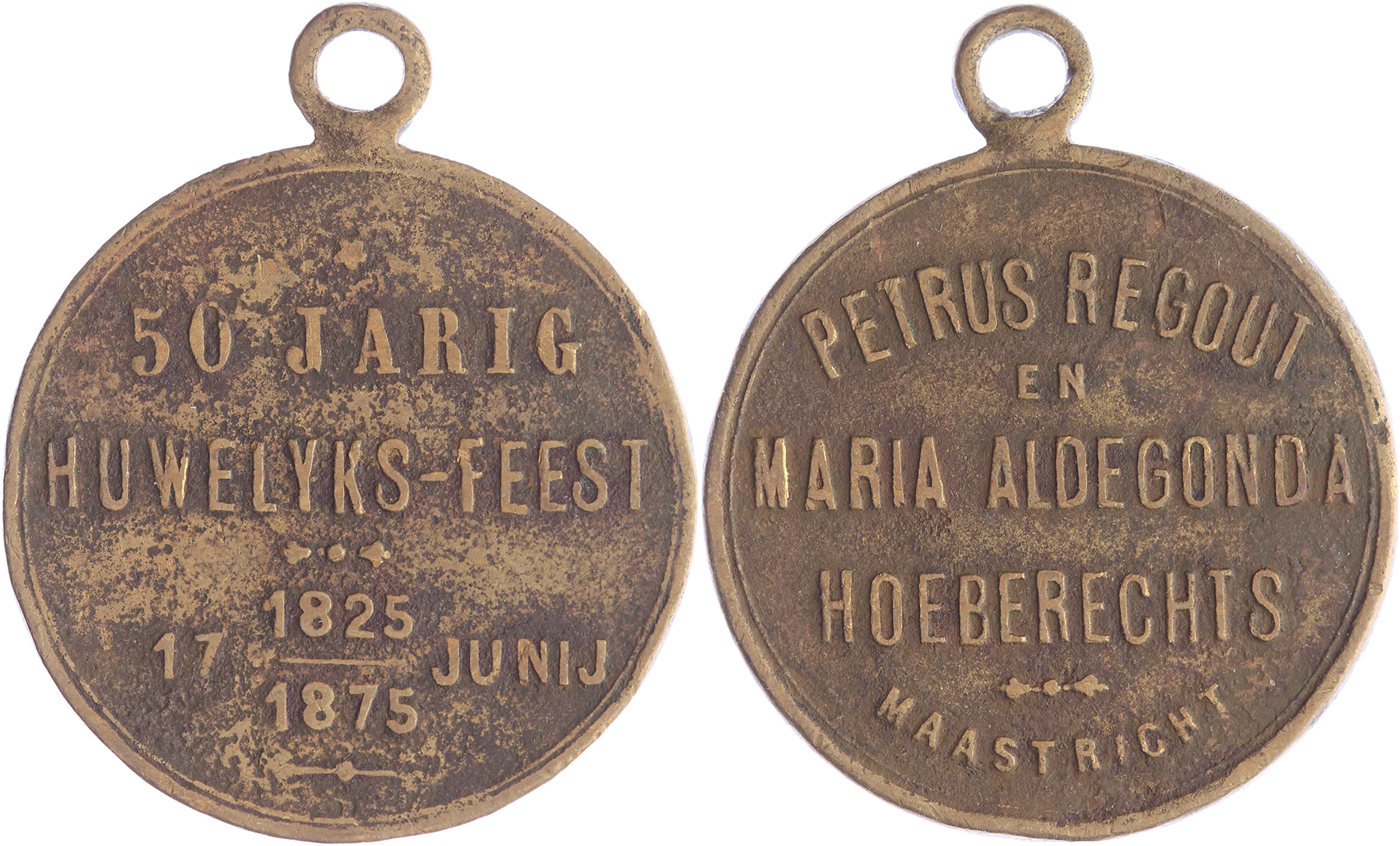 1875 50-Jarig huwelijk Petrus Regout & Maria Aldegonda Hoeberechts. Vz. + kz.: tekst.Messing 27,7 met draagoog. Zeer fraai.