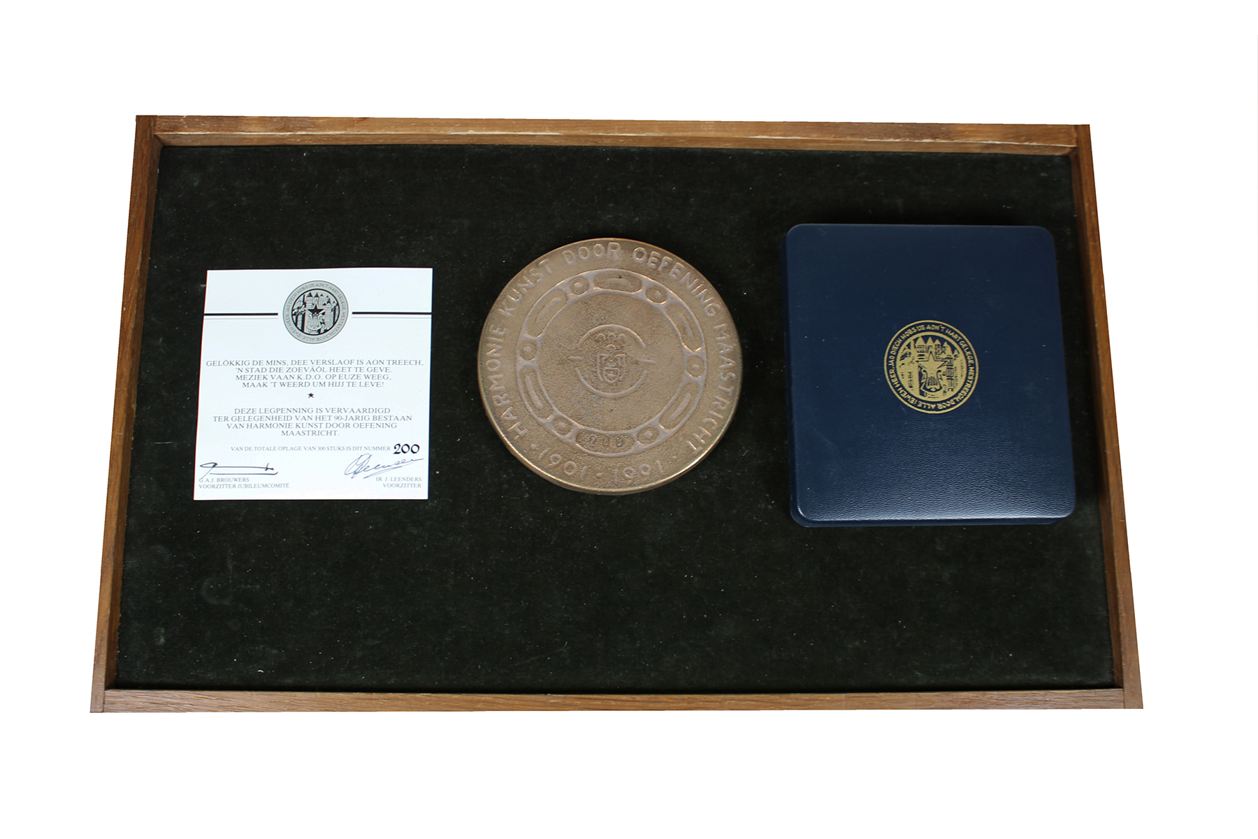 1991 Harmonie “Kunst Door Oefening” 90 jaar. Stadsgezicht met lier en ster. / Logo en tekst.Æ gegoten 112 [0,79 kg.], nr. 200. (G. Vroemen). Prachtig.