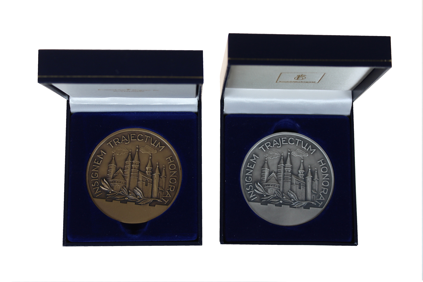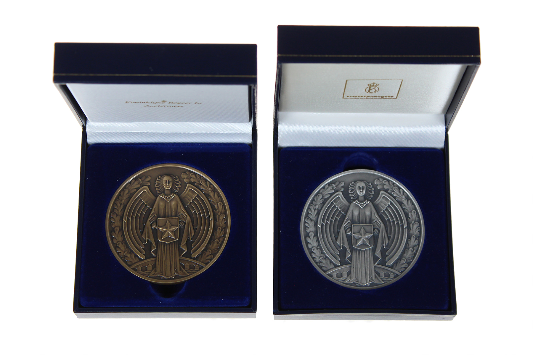Lot (2) z.j. Gemeentelijke erepenning. Stadsengel met (modern) wapenschild. / Kerktorens boven inscriptieruimte. Æ + AR [98,32 gr.]. Prachtig / FDC.Uit onze veiling 60, mei 2025, kavel 1124