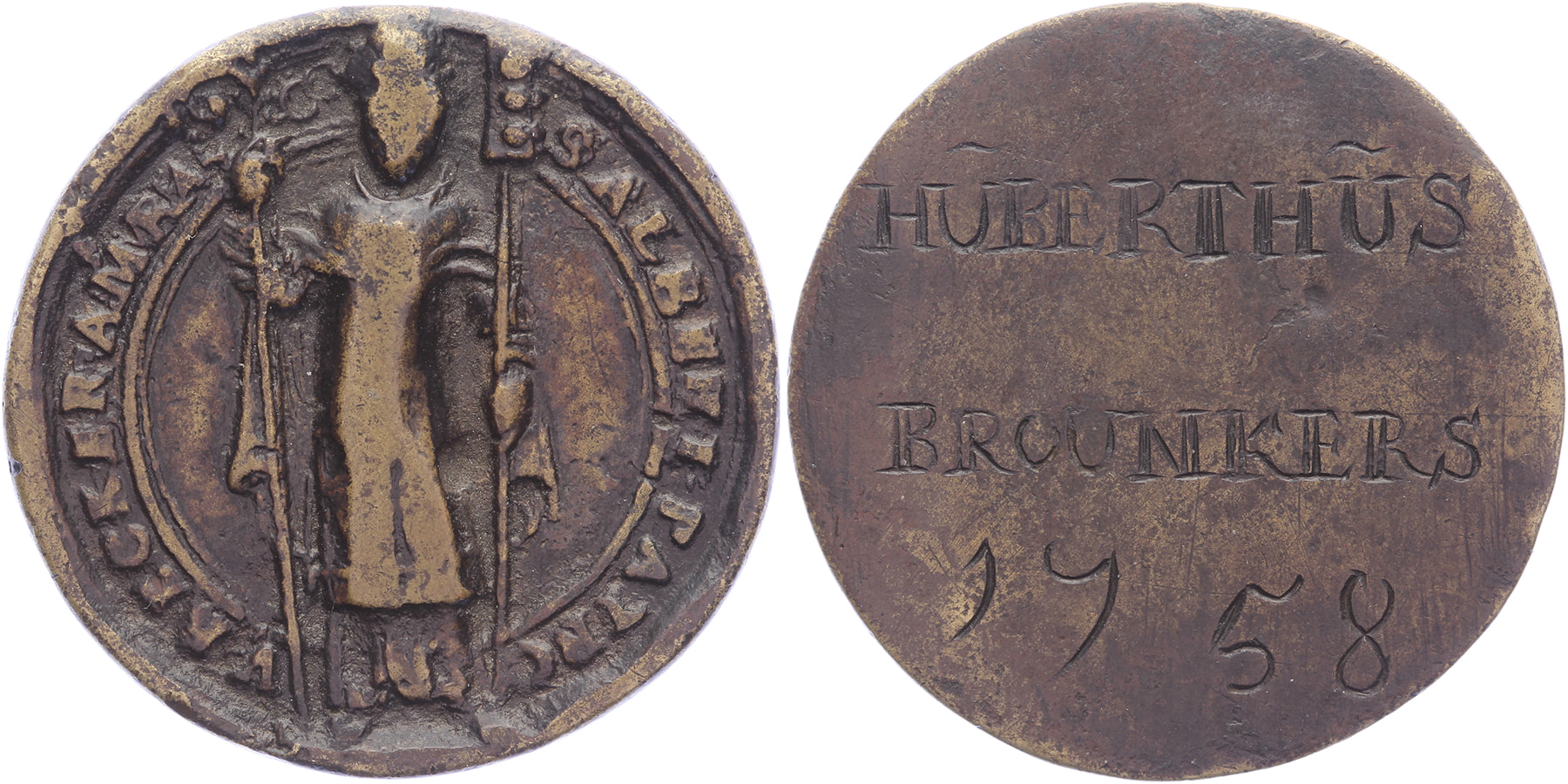 (1735) Bakkersgilde. Staande St. Albert. / Drieregelig gegraveerd opschrift. Op naam van HUBERTUS BROUNKERS 1758. Messing gegoten 38,6. Minard 349; WK 11.1. Fraai.