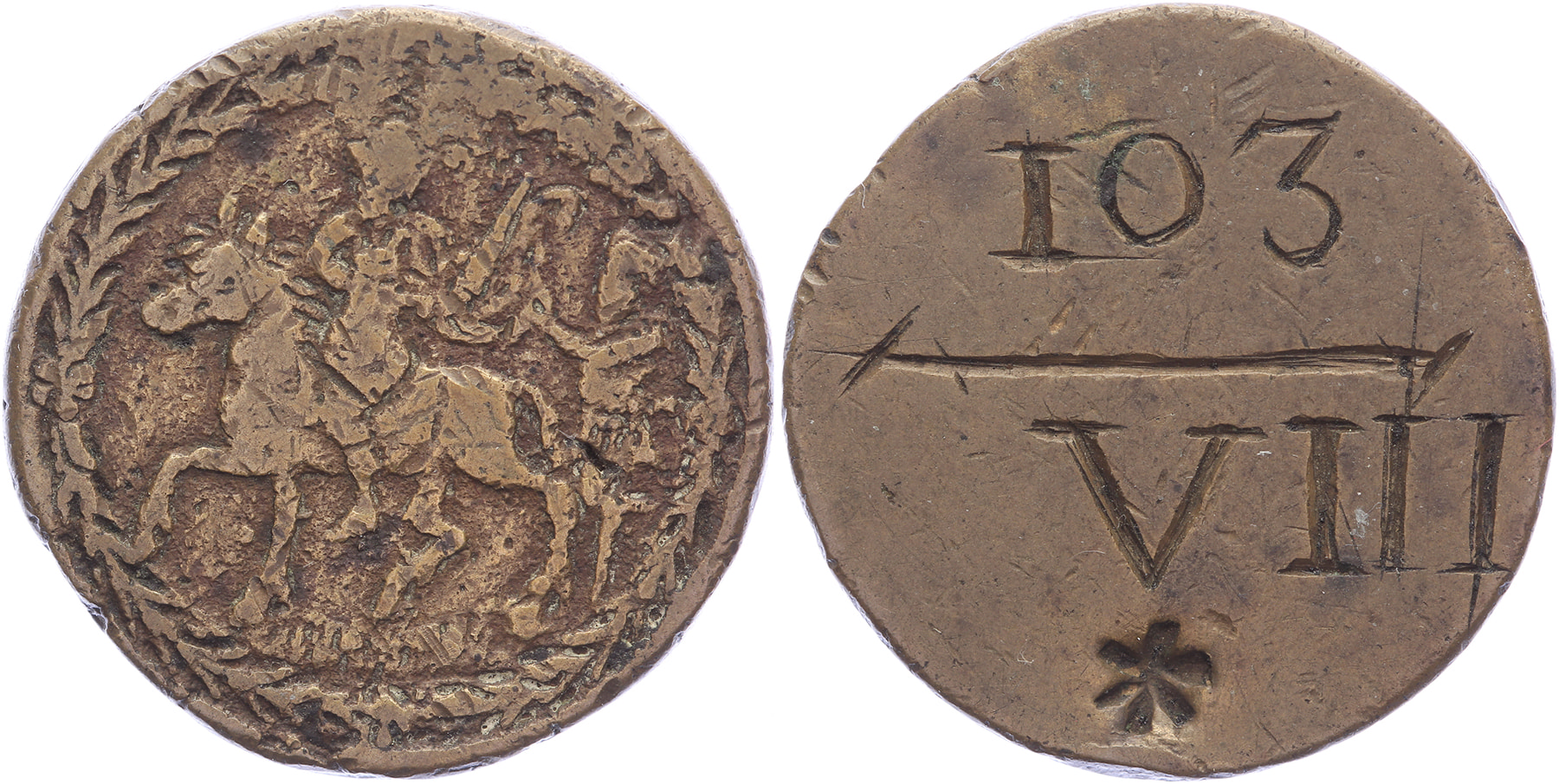(1733) Begrafenisloodje St. Martinuskerk. Binnen sierkrans St. Maarten te paard zijn mantel delend. / Gegraveerd: IO3 – VIII *. Messing gegoten 28,7. Vgl. Minard 357 (kz.). Fraai.