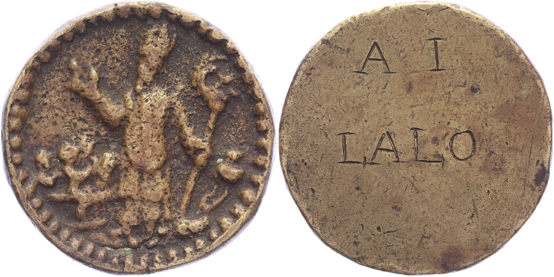 (1679) Kramersgilde. Staande St. Nicolaas met bisschopsstaf. / Gegraveerd: A. I. LAIOMessing gegoten 31,9. Minard 331; WK 13.2 (suppl. I). Fraai.
