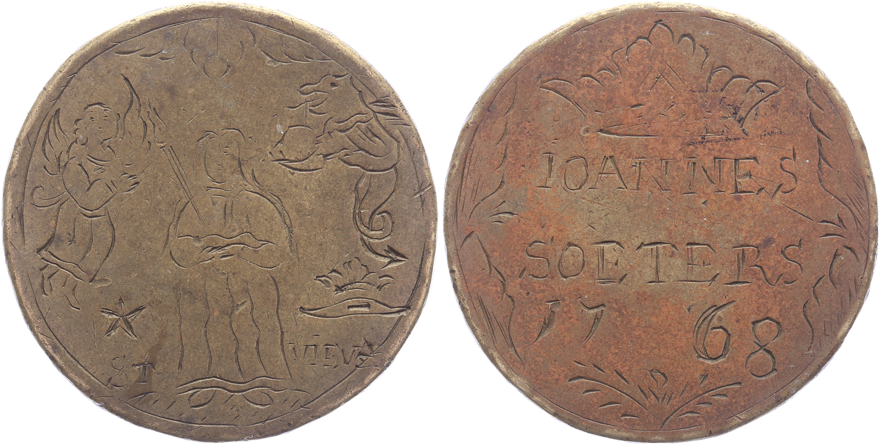 1768 Lakenweversgilde. Staande St. Genoveva met fakkel tussen het Goede en het Kwade. / IOANNES SOETERS 1768. Messing geheel gegraveerd 45,5. Minard 347 (dit exemplaar!); WK 7.2. Uitermate zeldzaam. Zeer fraai.