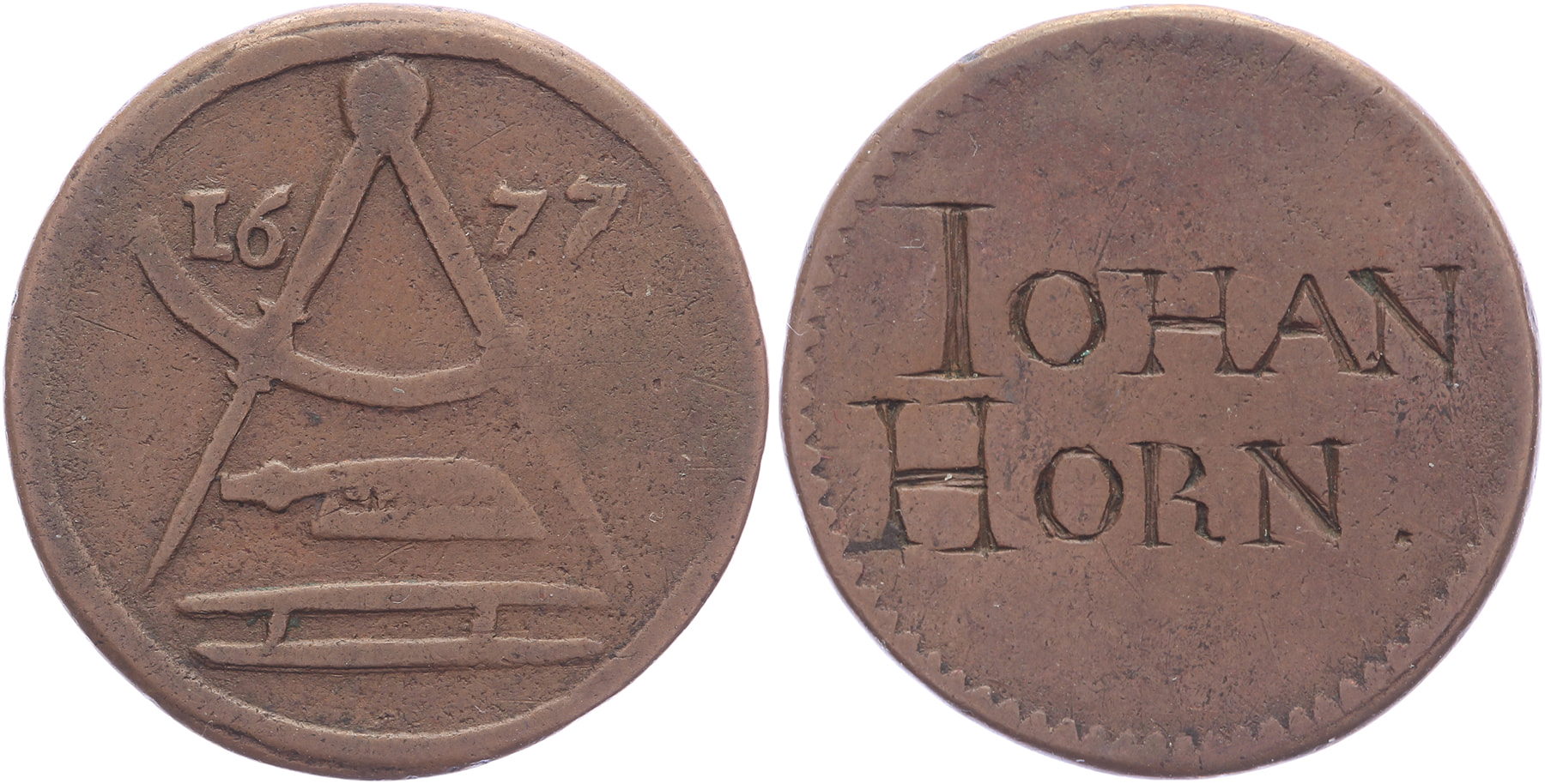 1677 Timmermansgilde. Veerpasser, handzaag etc. / Gegraveerd: IOHAN HORNÆ gegoten 25,9. Minard 326. Bijna zeer fraai.