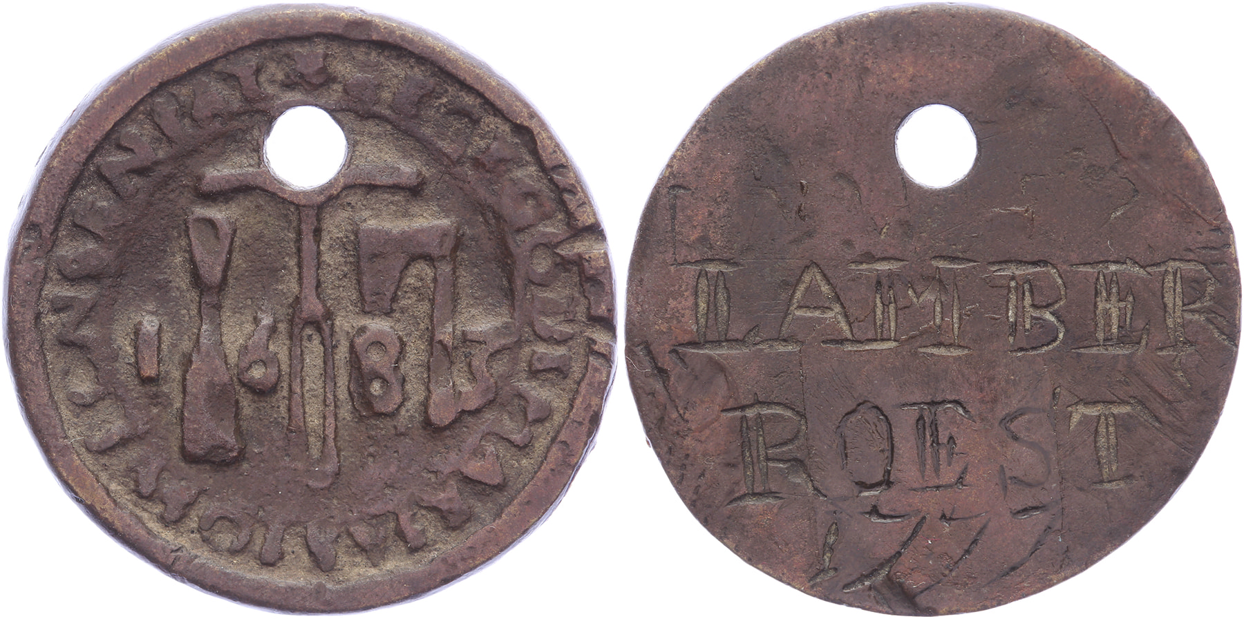 1683 Timmermansgilde. Diverse timmermansgereedschappen. / Gegraveerd: LAMBER ROEST 1777. Messing gegoten 29,5. Minard 327; WK 2.1. Met pengat. Fraai / zeer fraai.