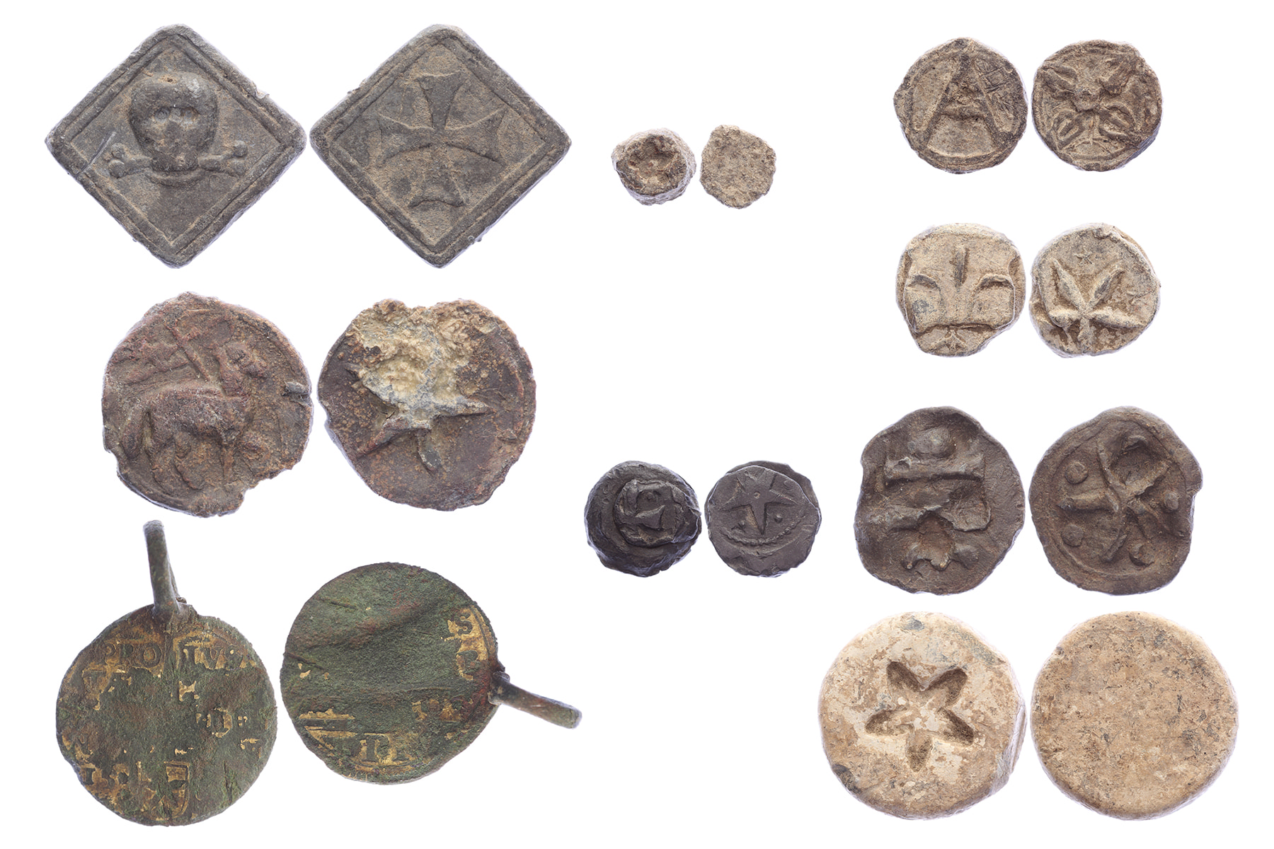 Lot (9) diverse loodjes van Maastricht uit grondvondst. Sommige nauwelijks determineerbaar, sommige goed leesbaar. Puzzelwerk!