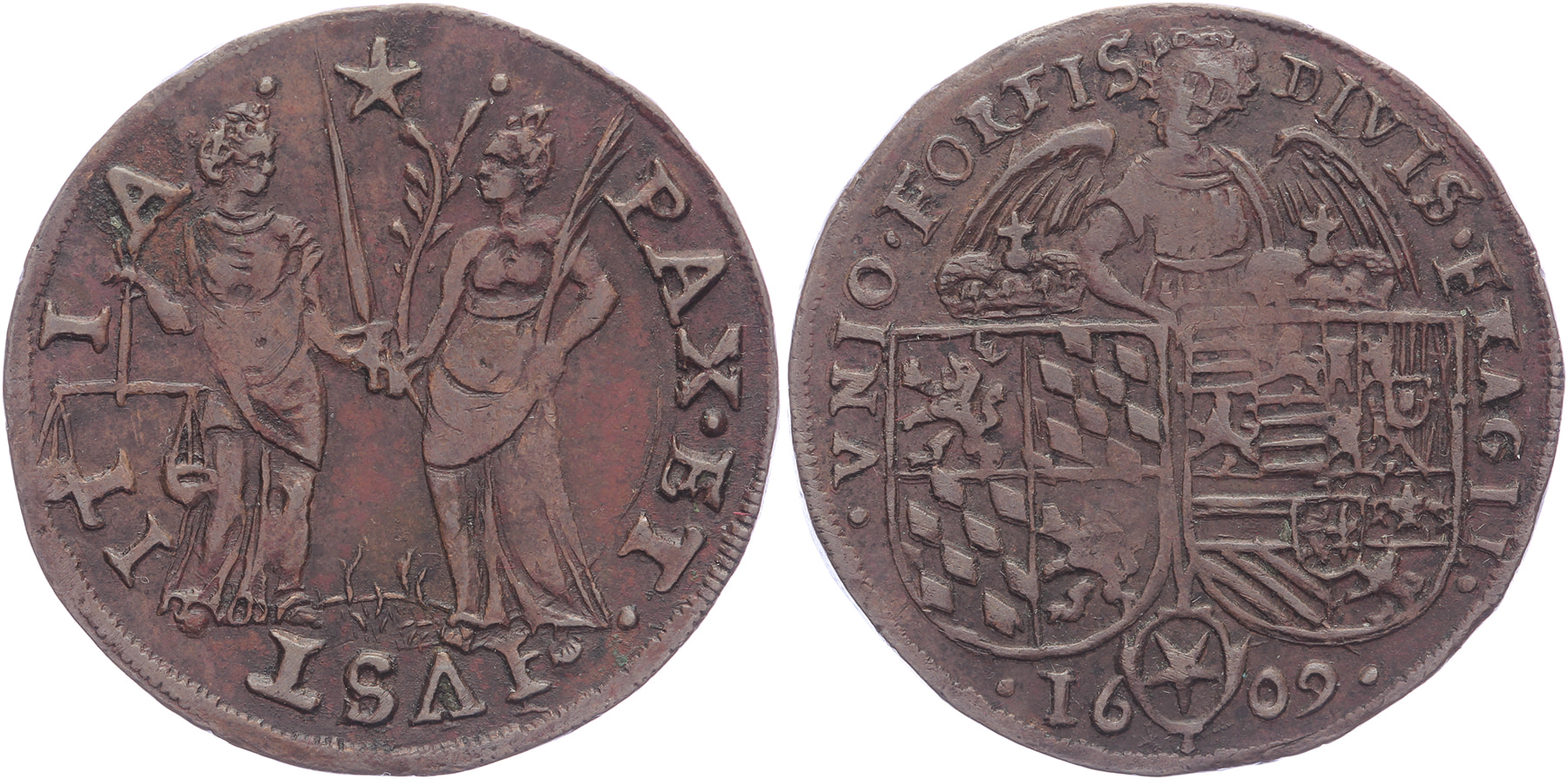 1609 Maastricht, vrede en gerechtigheid. Staande Vrede & Gerechtigheid houden palmtak vast. Ster van Maastricht bovenaan. / Engel boven wapenschild van Ernst van Beieren en de aartshertogen.Æ 29,8. Dugn. 3661. Ruim zeer fraai.