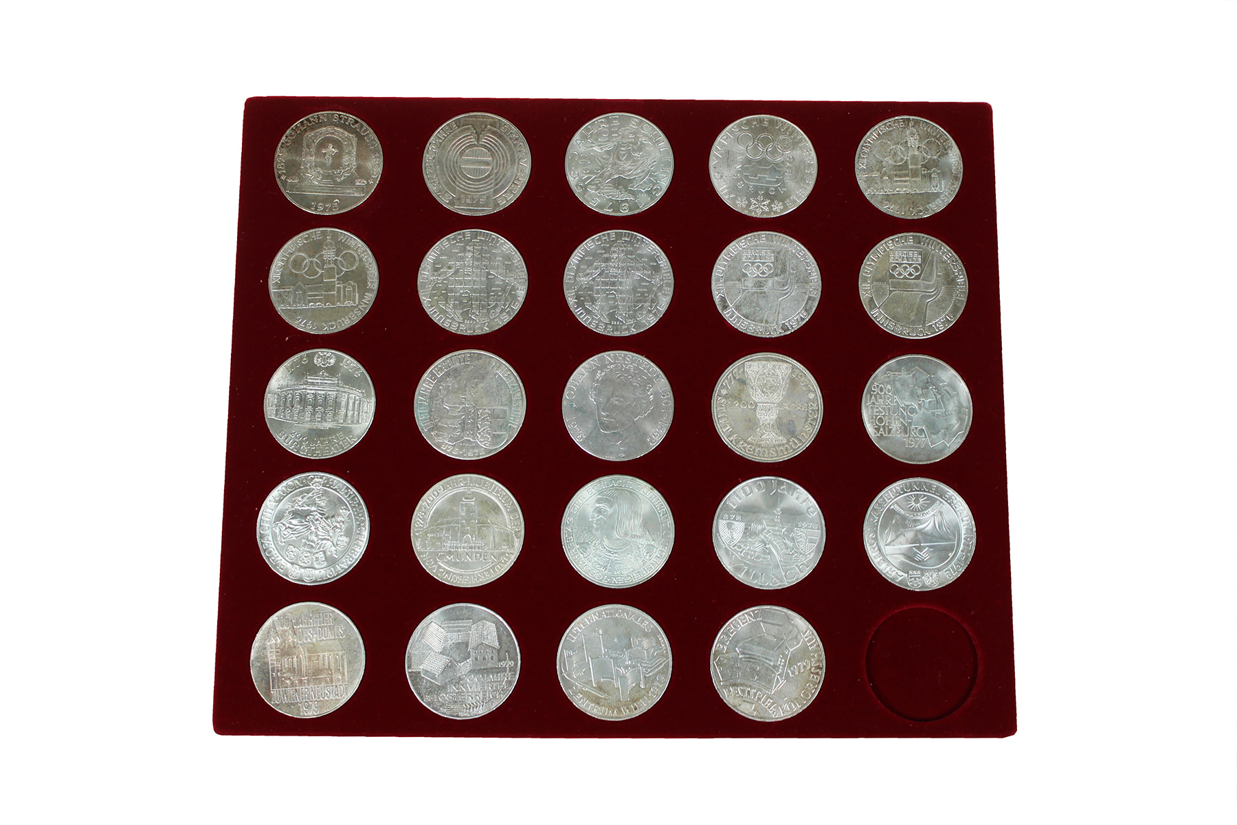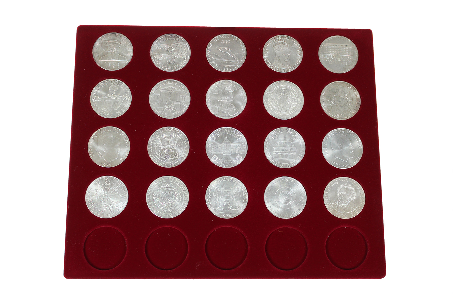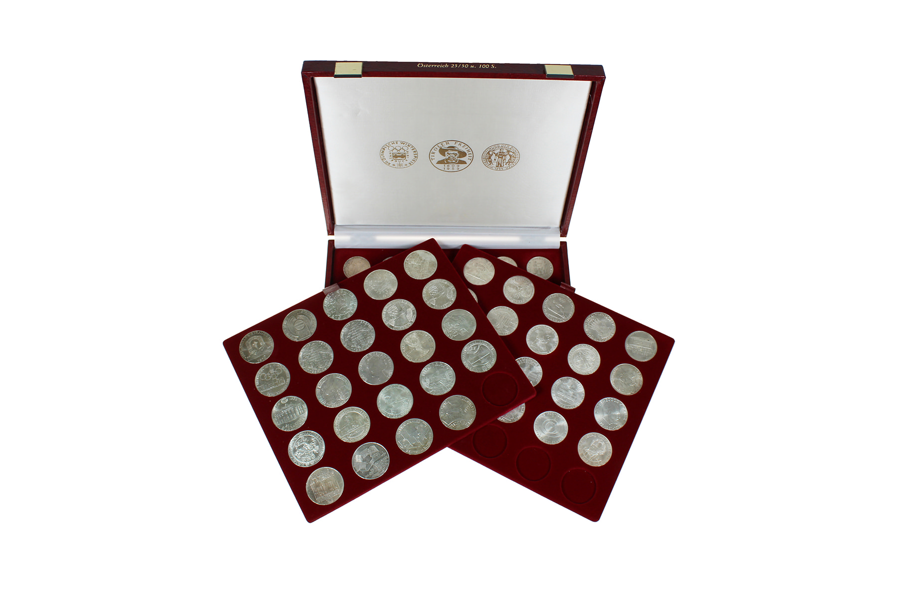 Luxe cassette met 19 stuks 25 Schilling, 20 stuks 50 Schilling en 24 stuks 100 Schilling periode 1955-1979. Alle AR.
