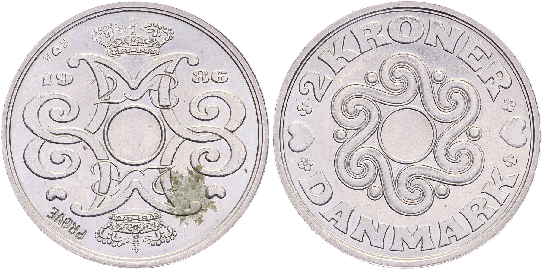 2 Krone 1986. Pattern, without hole, interrupted edge milling 6 x 7 grooves. KM Pr52g. Unc.