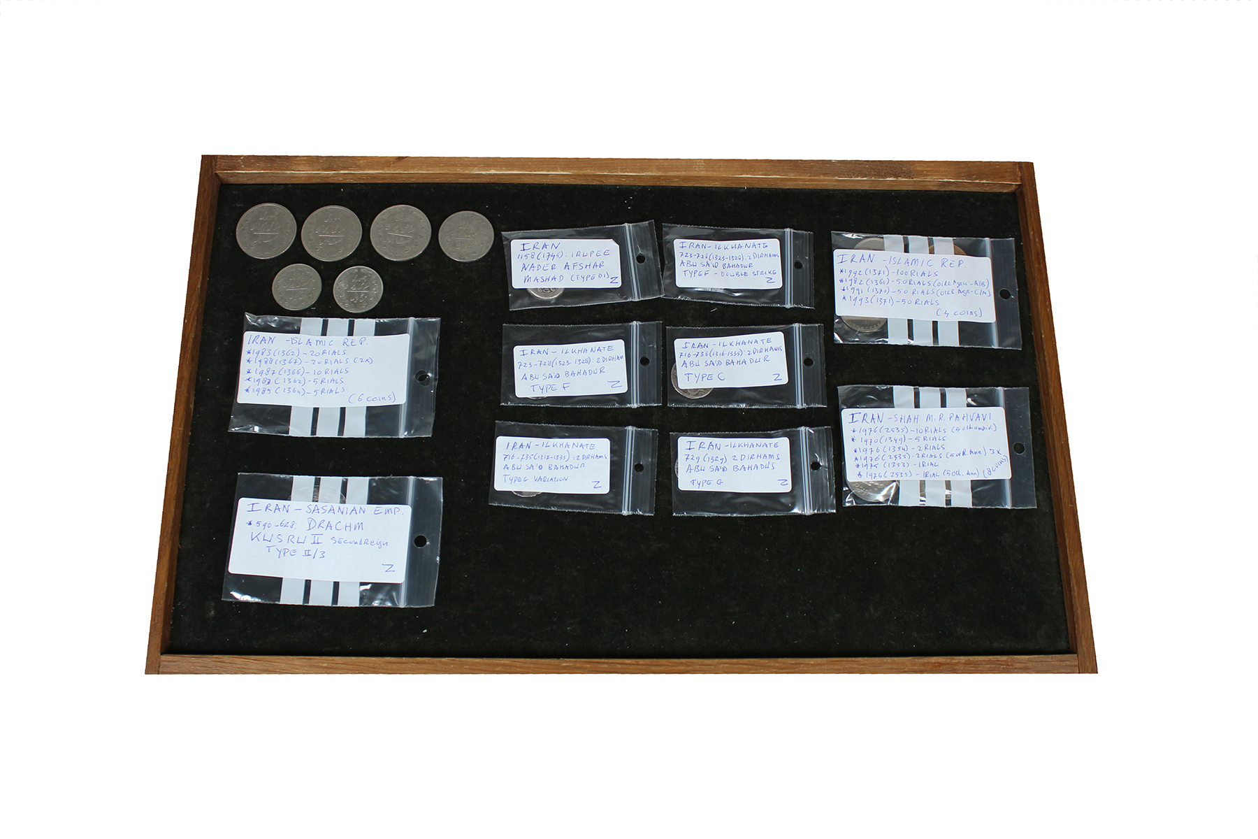 Iran. Doosje met diverse munten Iran. O.a. oude zilveren munten zoals 5x 2 dirhams, een rupee en een drachme. Alle munten zijn uitgebreid omschreven. Kijken!
