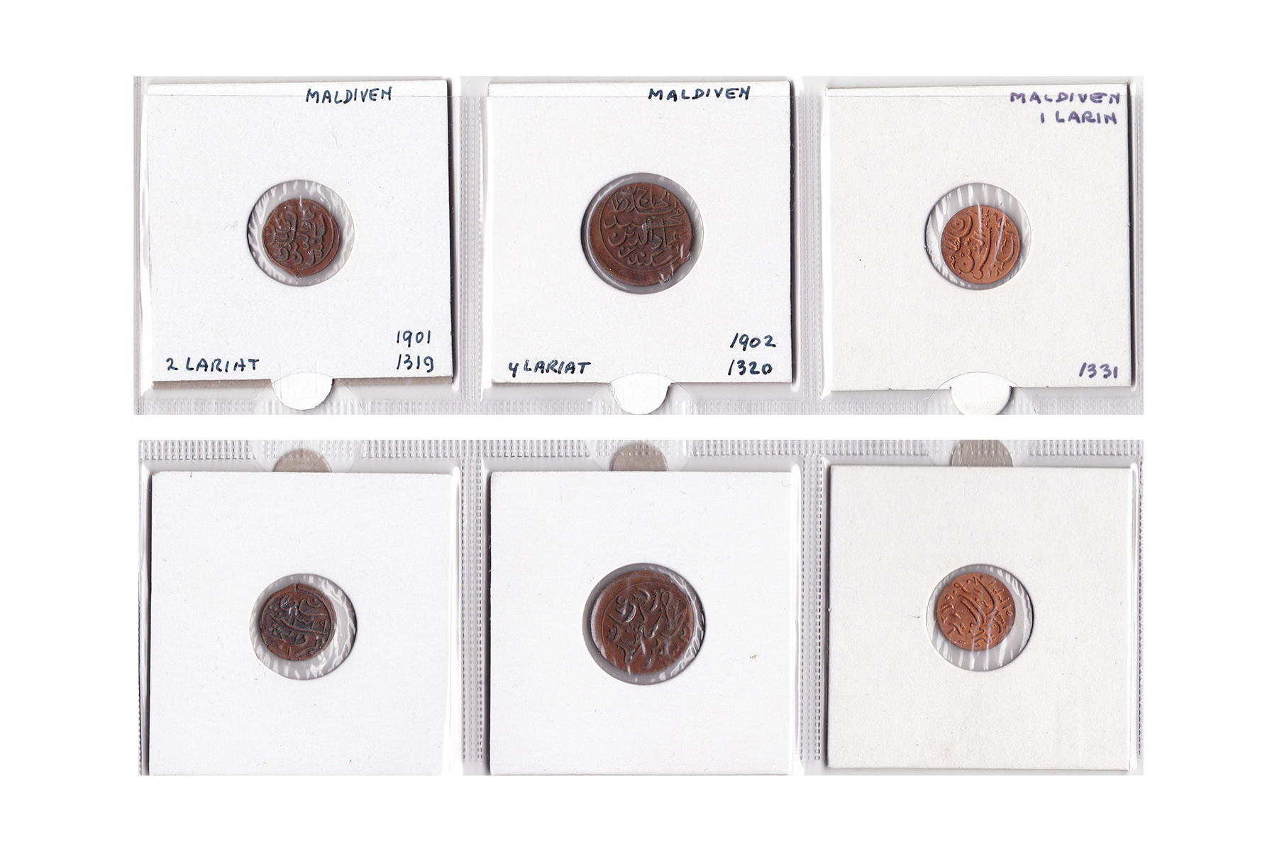 Malediven (3). Blikje met 1 Larin 1931 UNC, 2 Lariat 1901 en 4 Lariat 1920 in mooie kwaliteit.