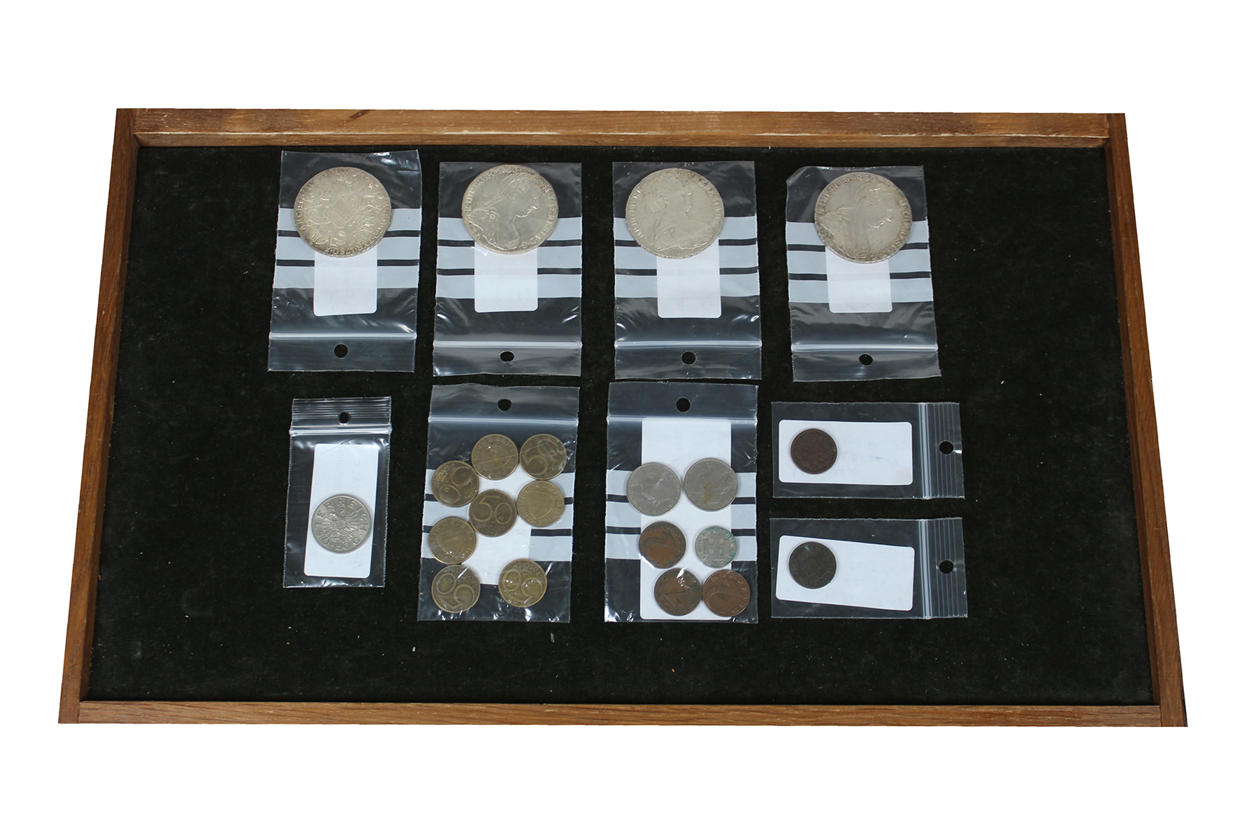 Oostenrijk. Doosje met munten tussen 1780 en 1935 waaronder 4x zilveren Maria Theresia thaler 1780 (naslagen).