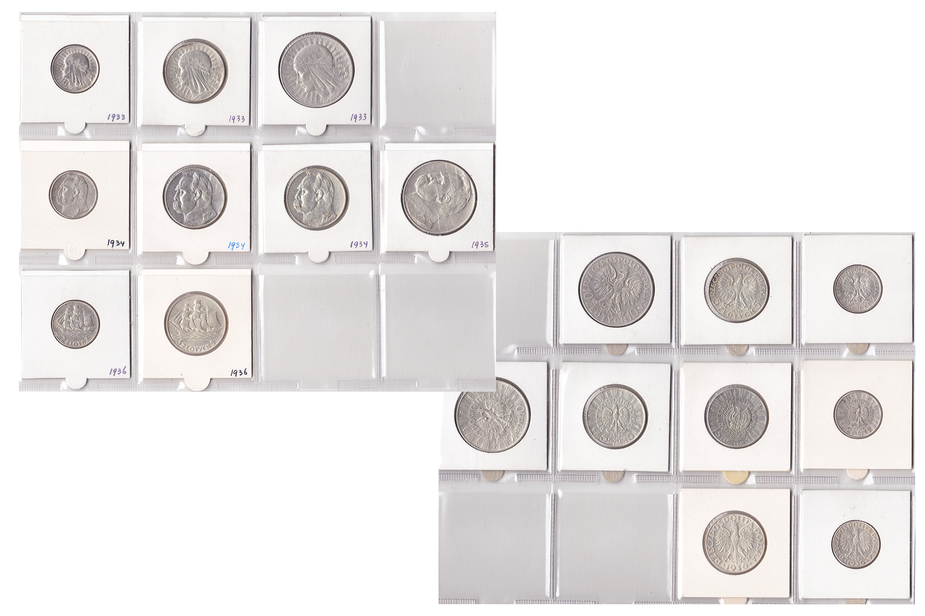 Polen (9). Blikje met 2 Zloty t/m 10 Zloty 1933 t/m 1936. Zeer fraai en beter.