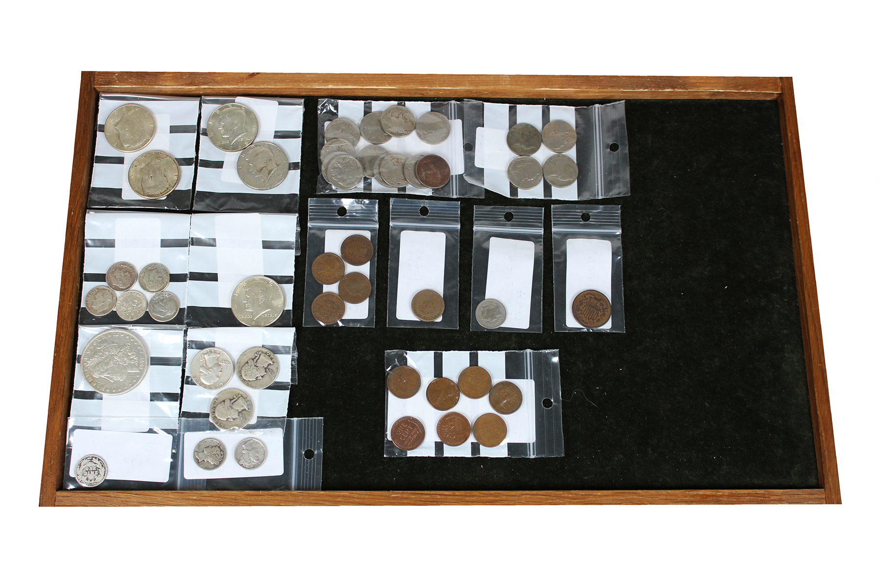 USA. Doosje met munten USA van cent t/m dollar waaronder 17 zilveren munten.
