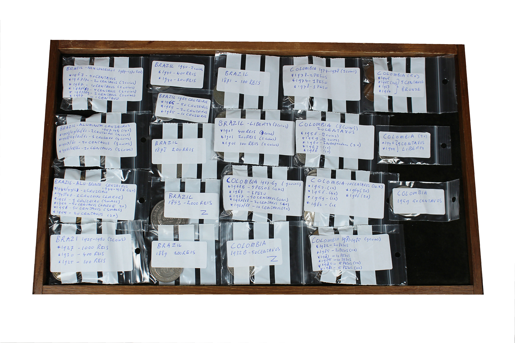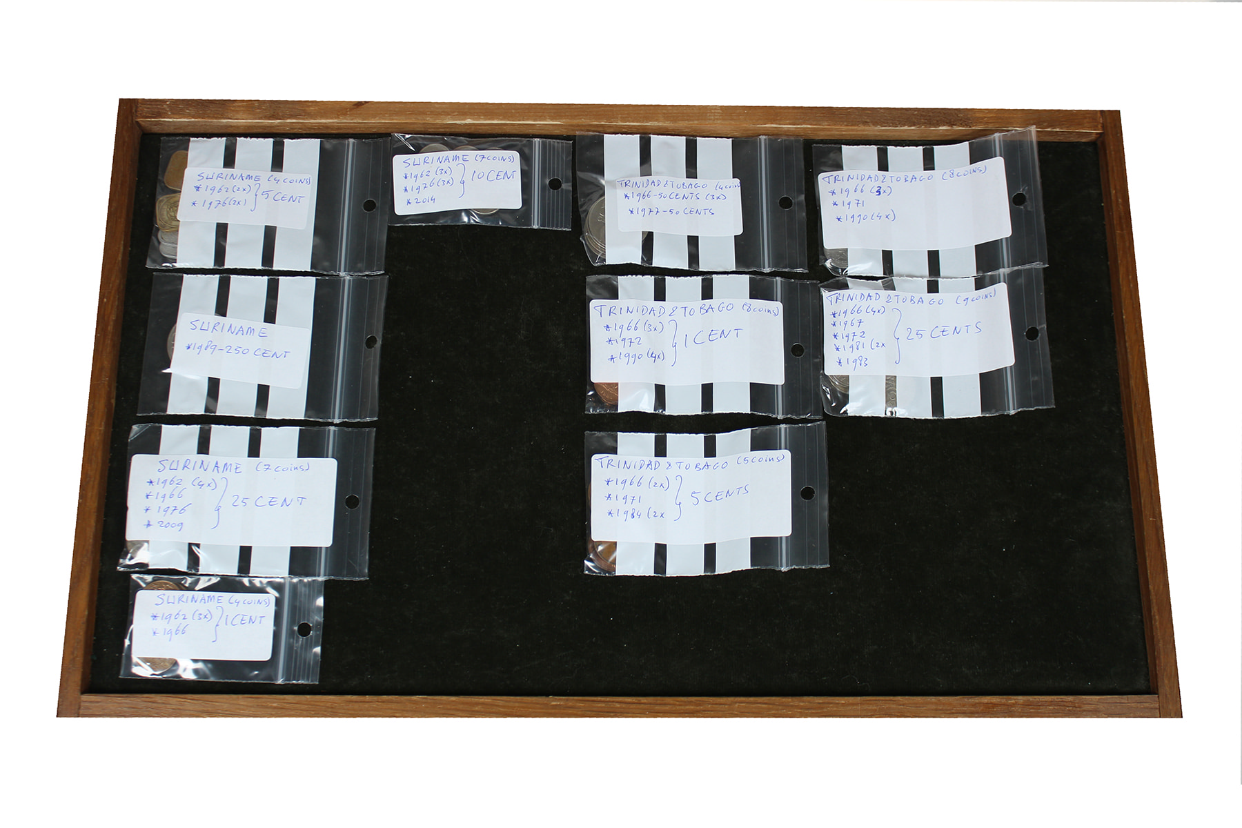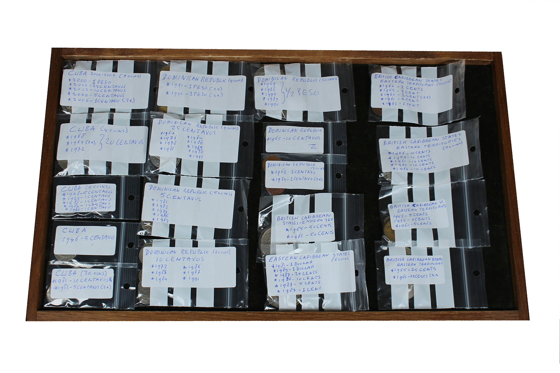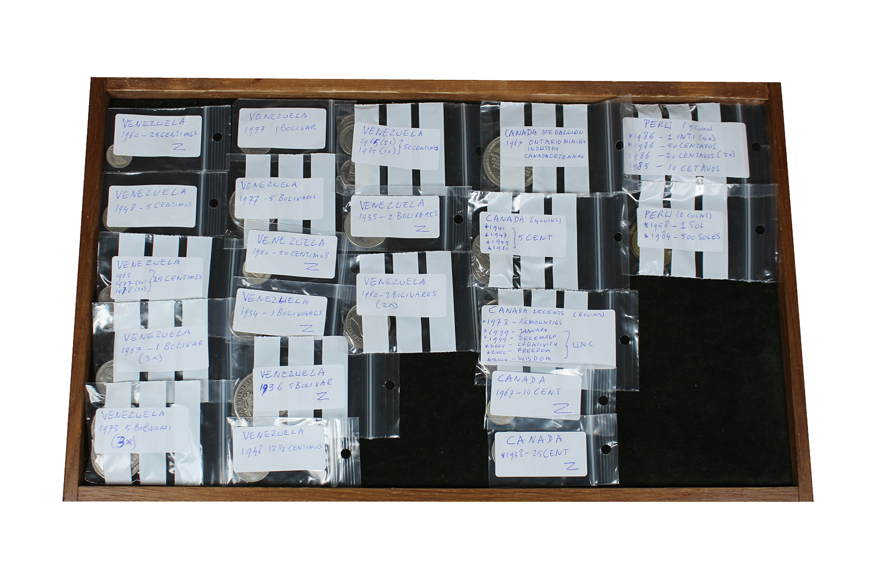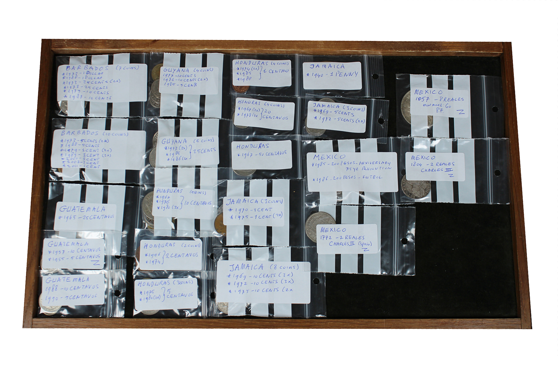 USA. Doosje met munten uit Noord-, Midden- en Zuid-Amerika alsook de Caribische eilanden. Her en der wat zilver. Netjes per land gesorteerd.