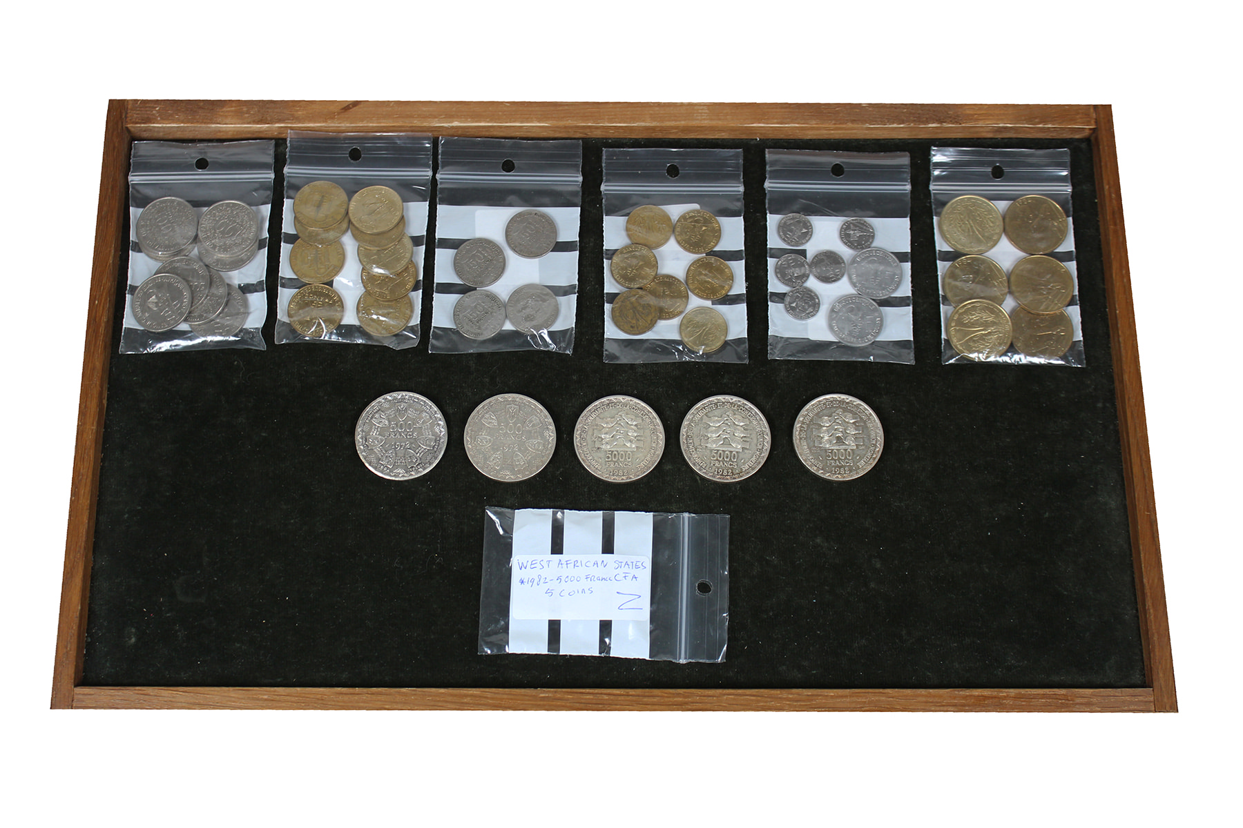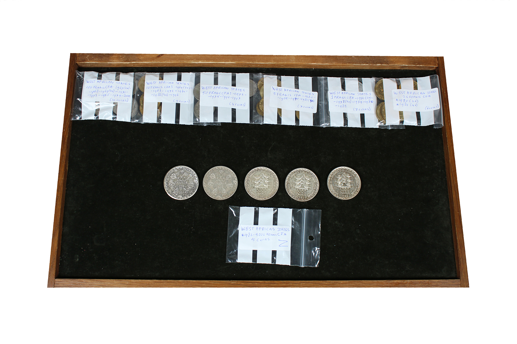 West African States. Doosje met diverse moderne munten, O.a. 5x 500 francs (= 112 gram netto AR).