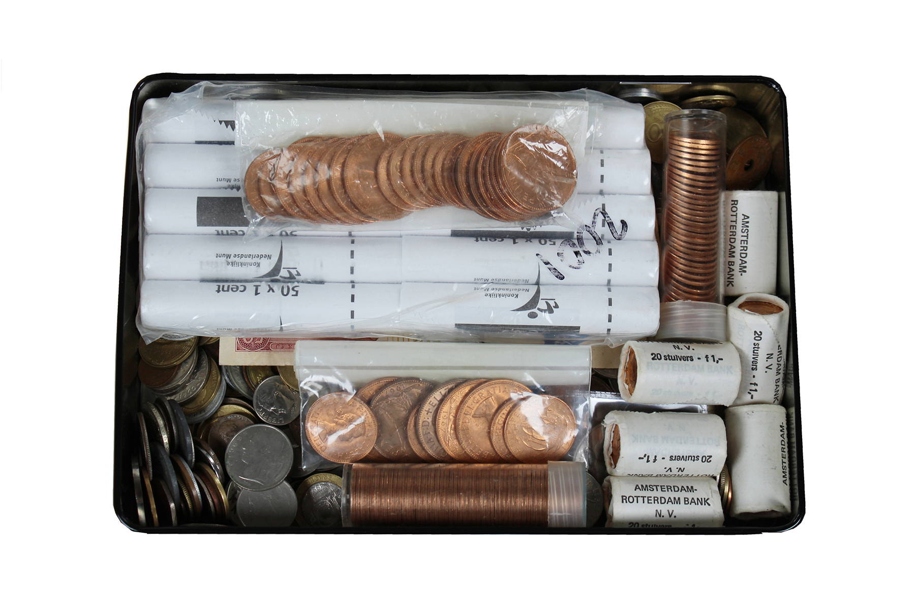 Ca. 2 kg. kilowaar voornamelijk buitenland. Toegevoegd: 10 muntrollen 50 Cents (Nederlandse Munt); 6 rollen stuivers (AMRO-bank)