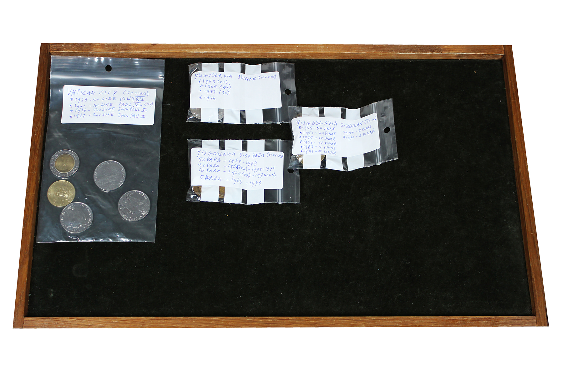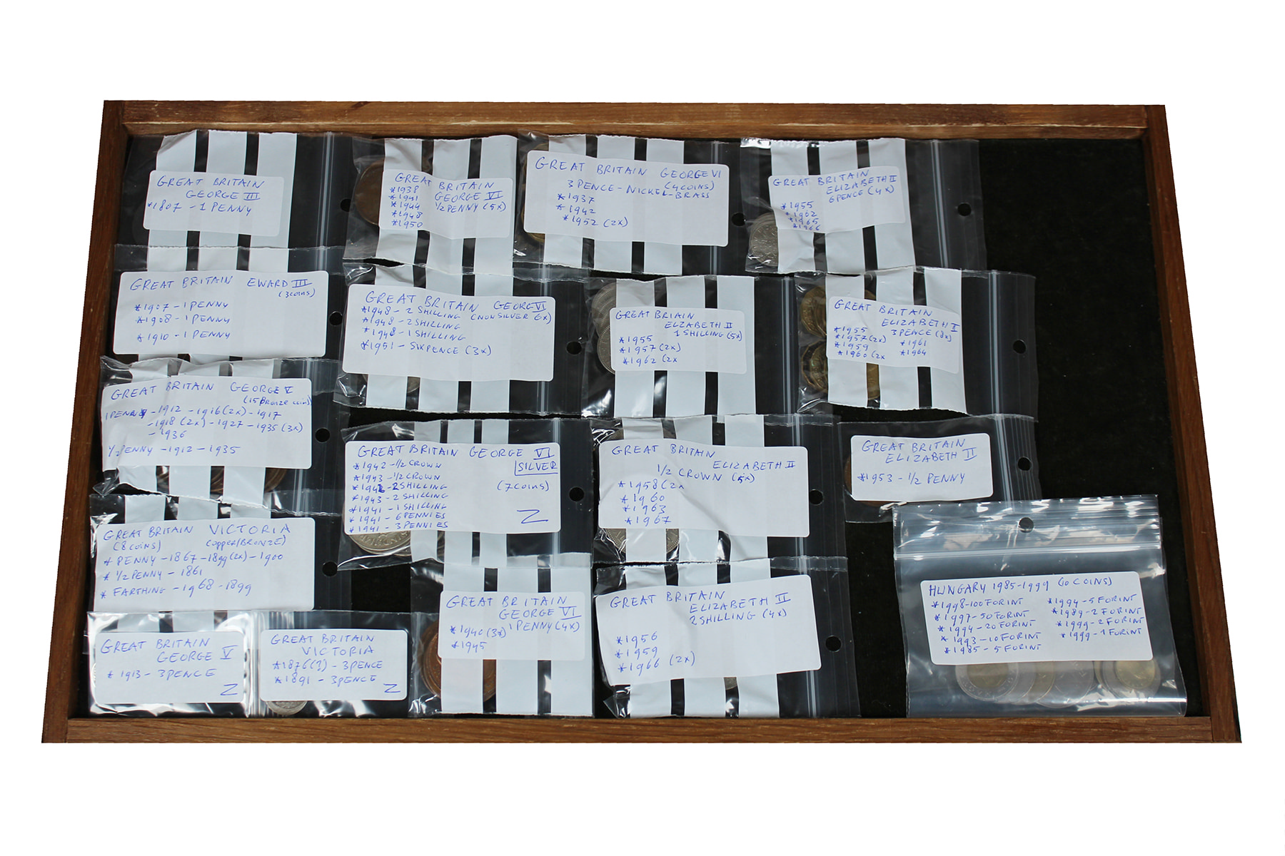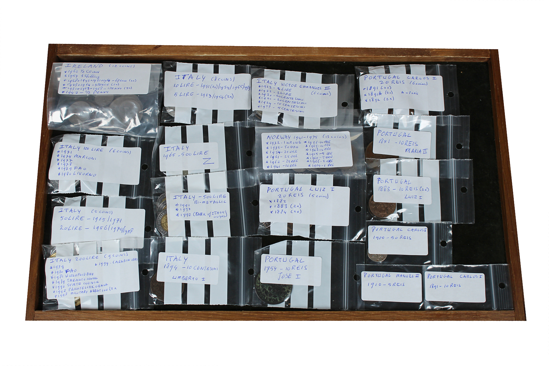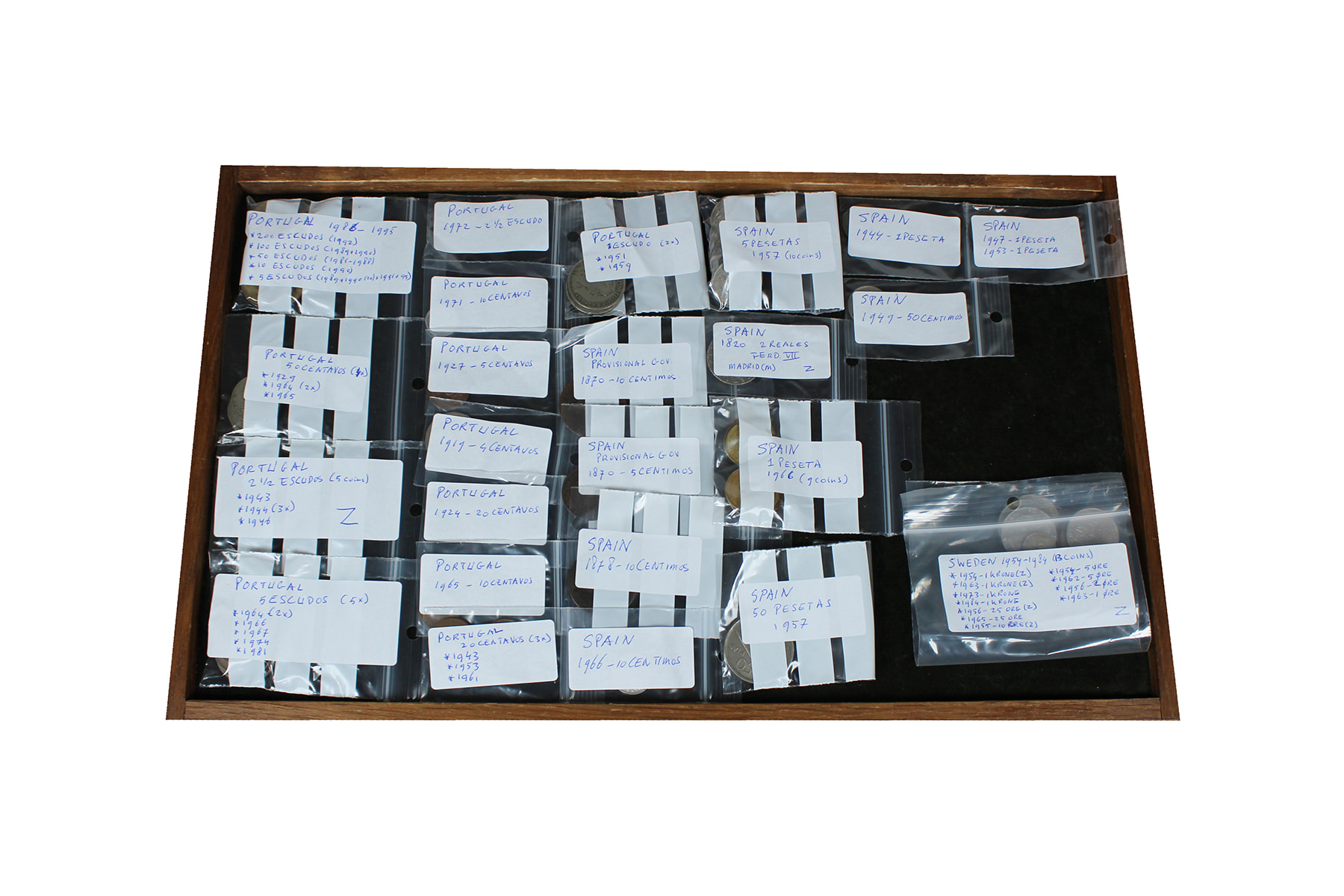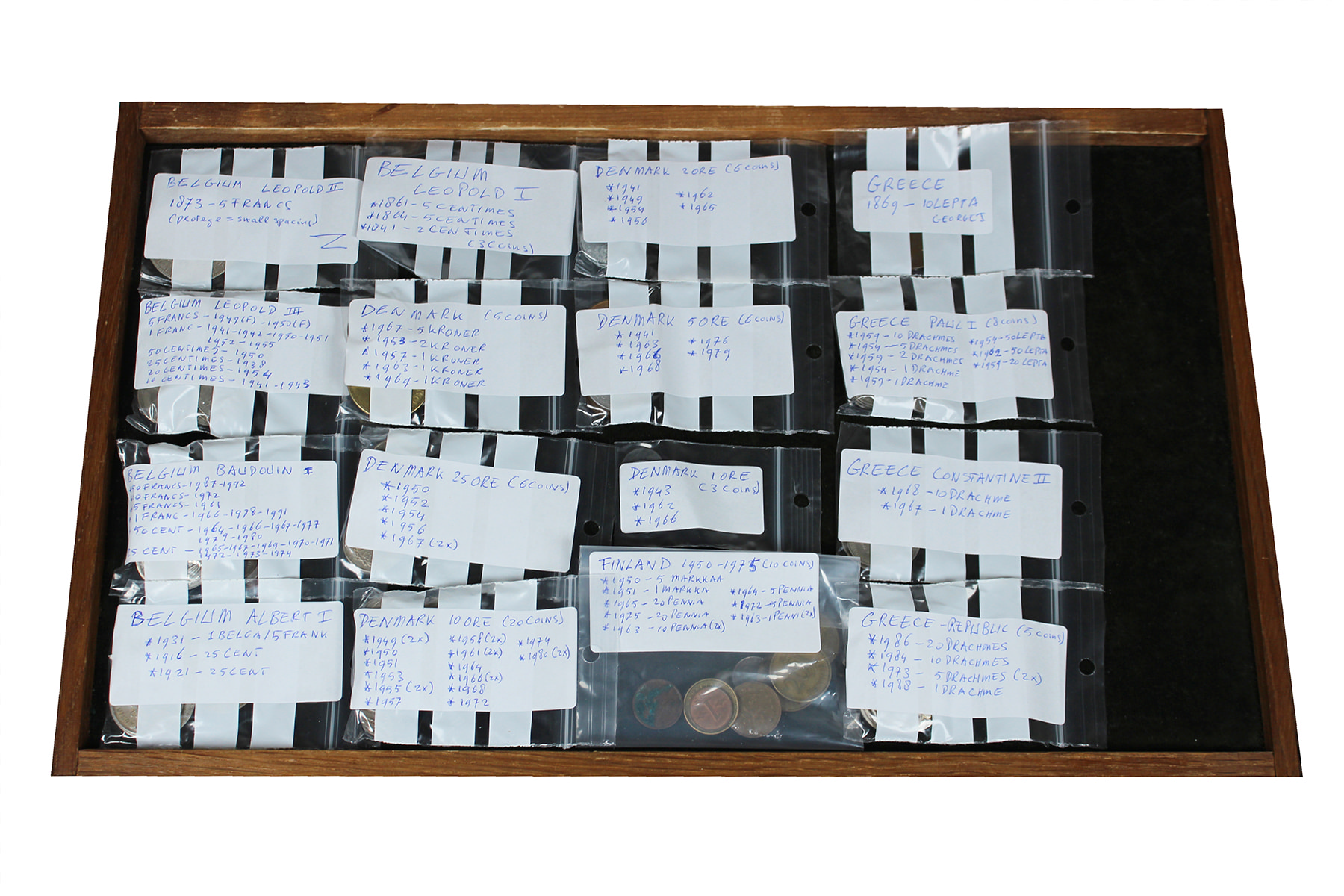 Doosje met munten diverse Europese landen. Netjes gesorteerd per land met hier en daar zilver.