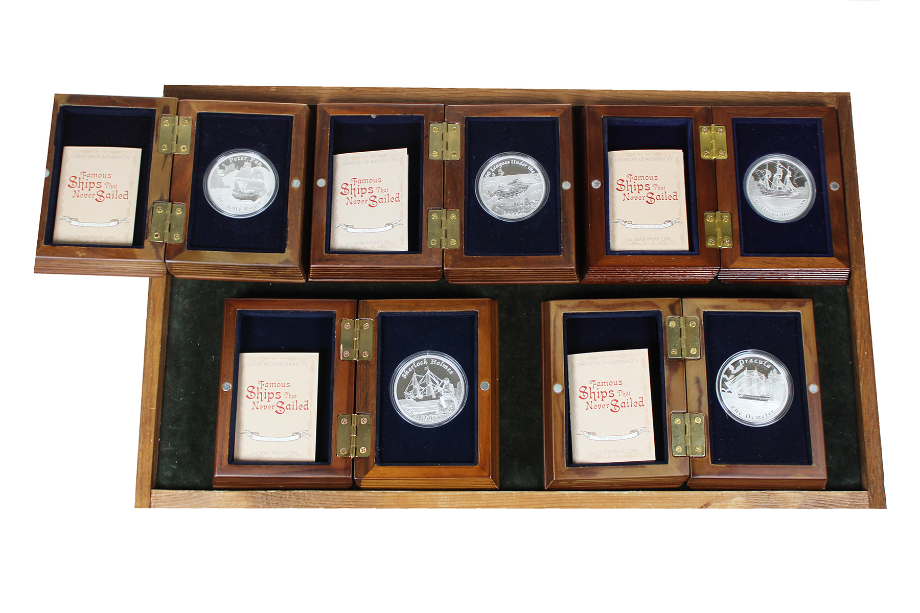 Kunststof box met 5 x zilveren troy-ounce munt Tuvalu ‘Famous ships that never sailed’ in originele cassette.