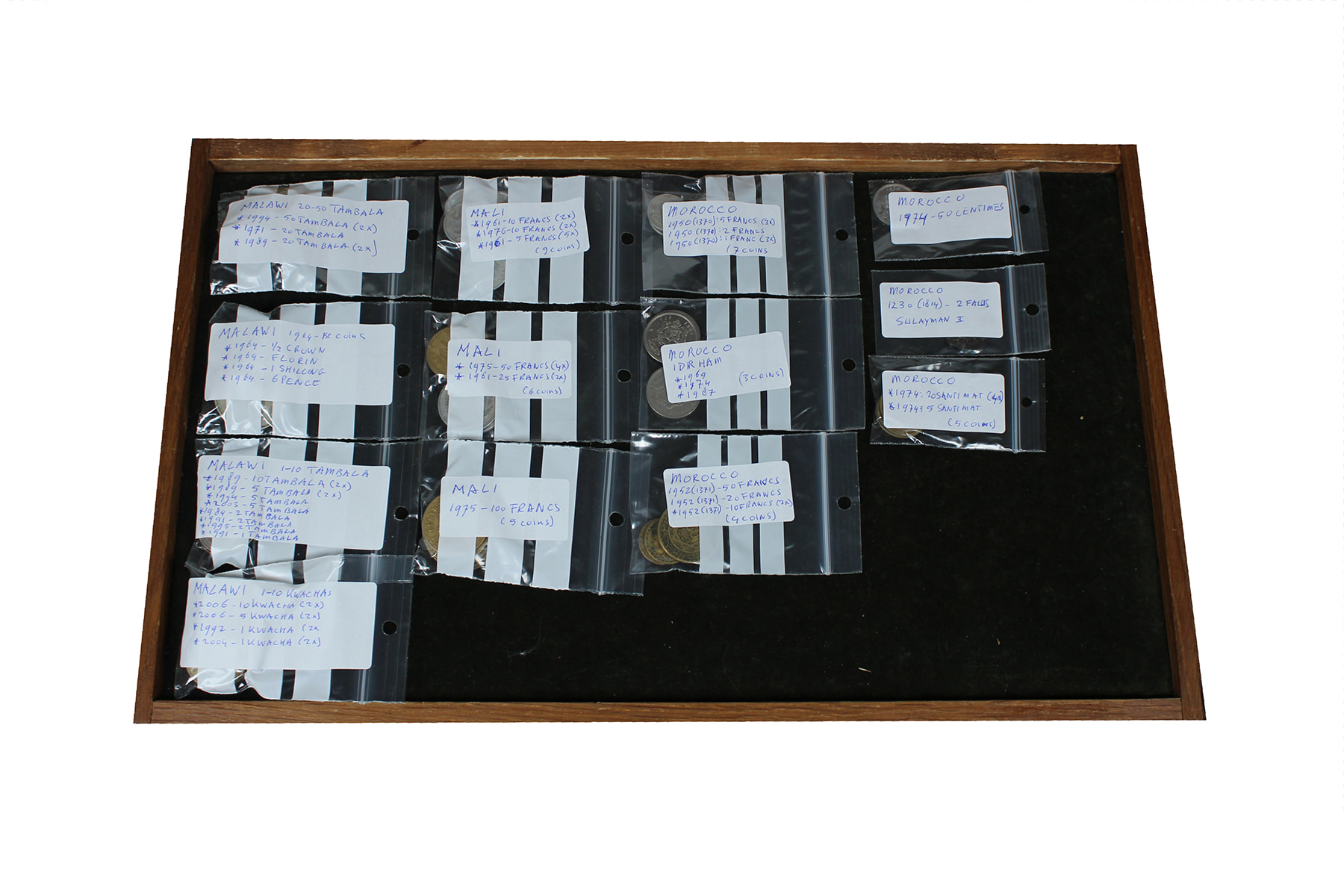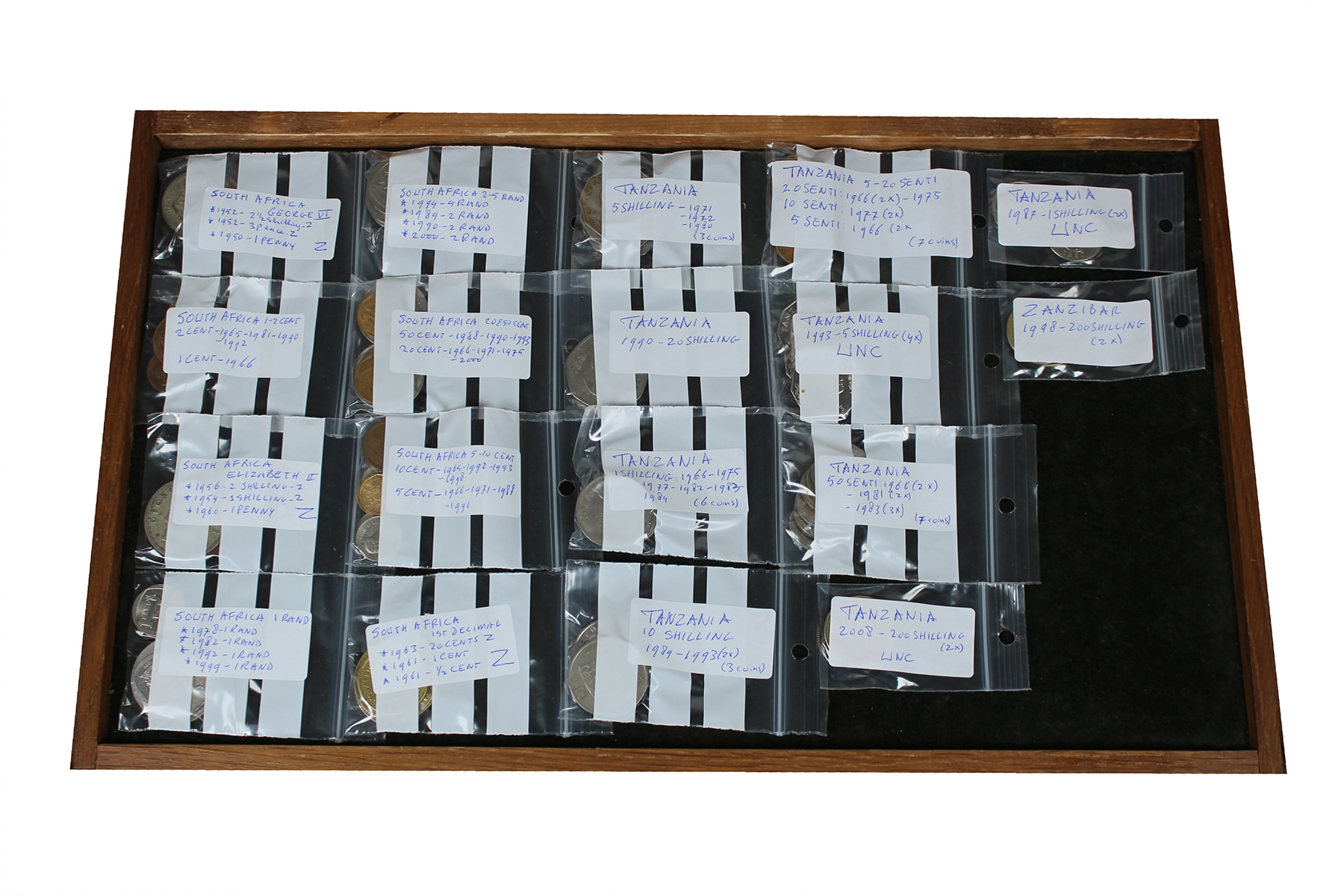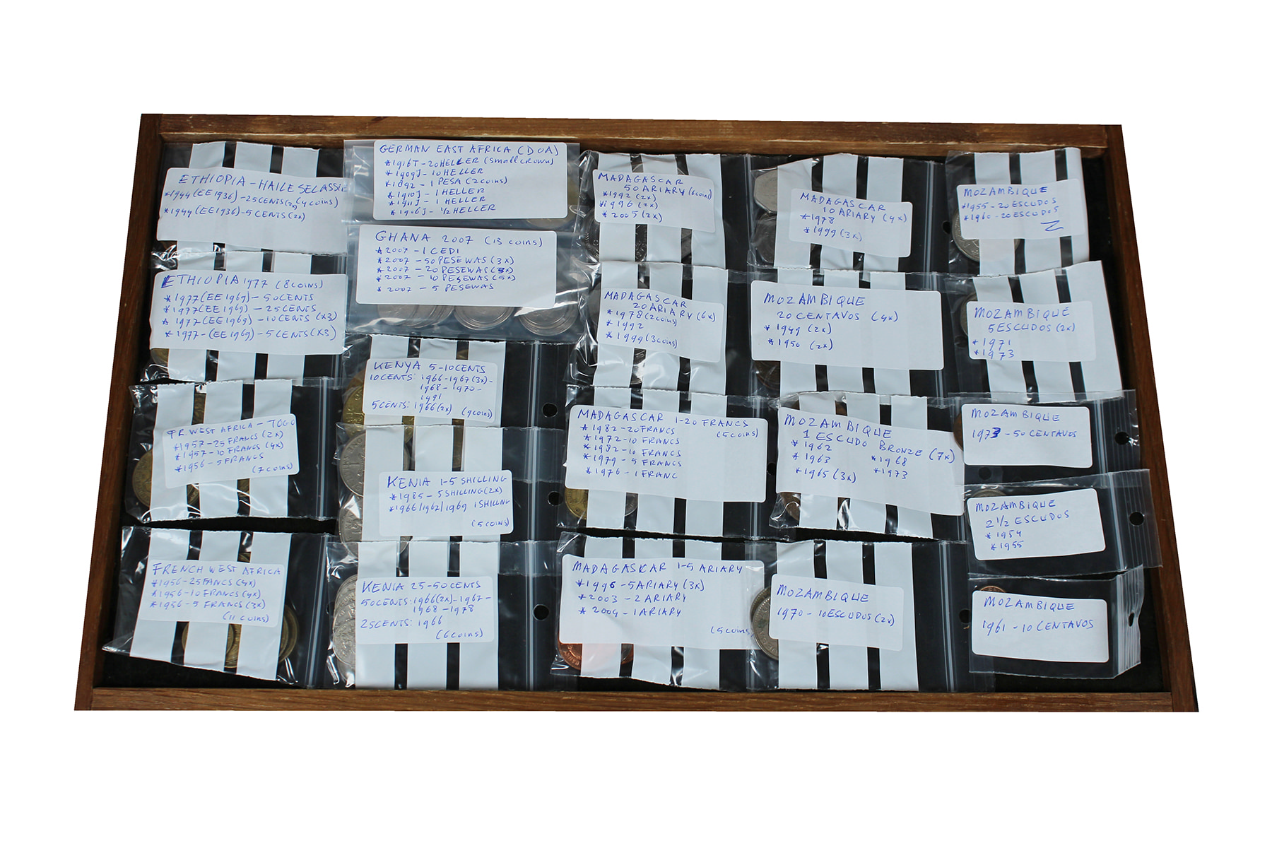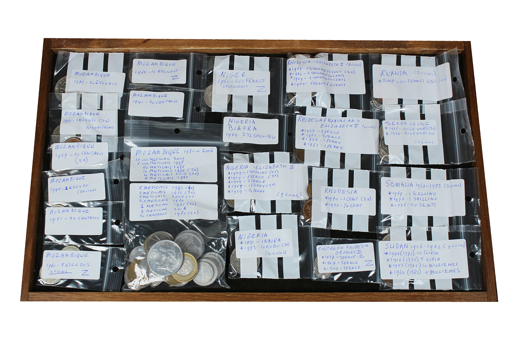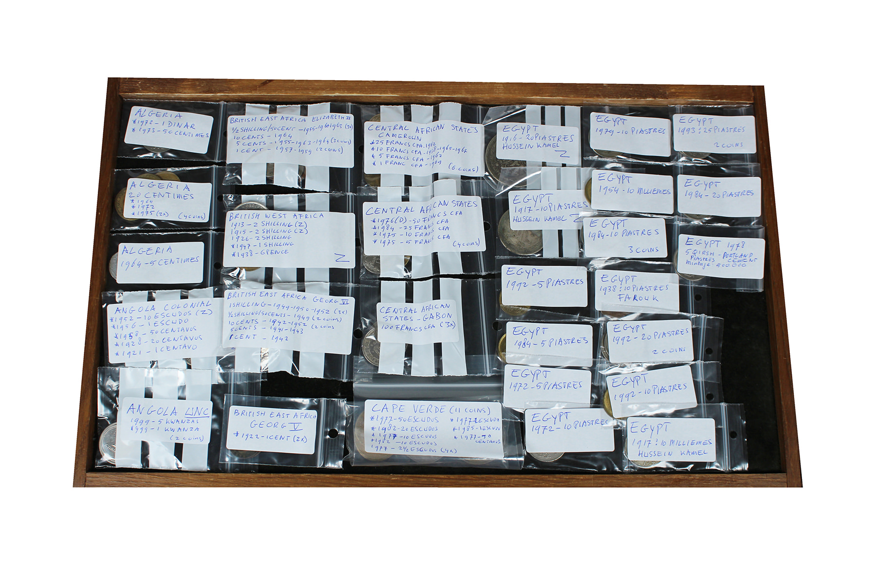 Doosje met munten 19e eeuw van diverse Afrikaanse landen. Netjes per land gesorteerd. Ook zilver aanwezig.