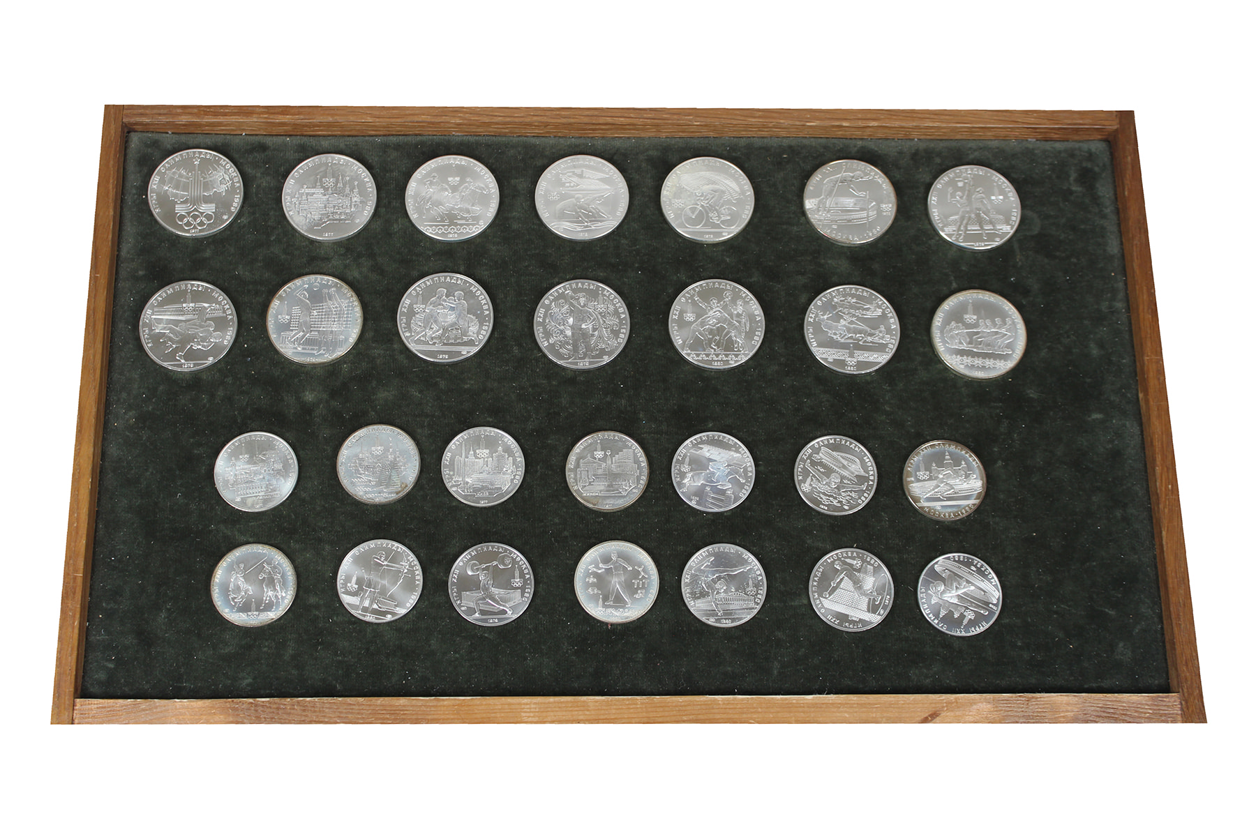 Bruin kistje met complete serie zilveren munten Olympische Spelen Rusland 1980. 14 x 5 en 14 x 10 Roebel. Netto 630 gram.