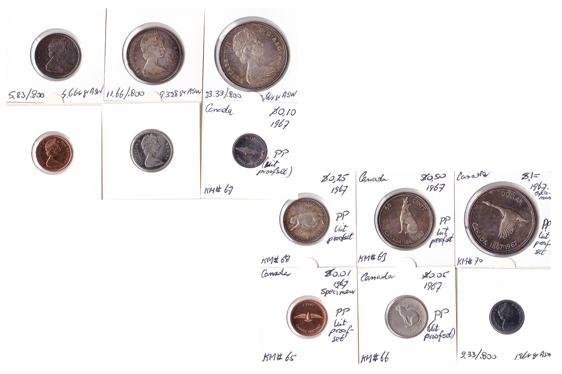 Lot (7) Canada (6), 1 cent t/m 1 dollar (1967). KM 65-70 proof; Zuid-Afrika (1), 1 Rand 1974. Donkere toning KM 89. Afkomstig uit proofset.