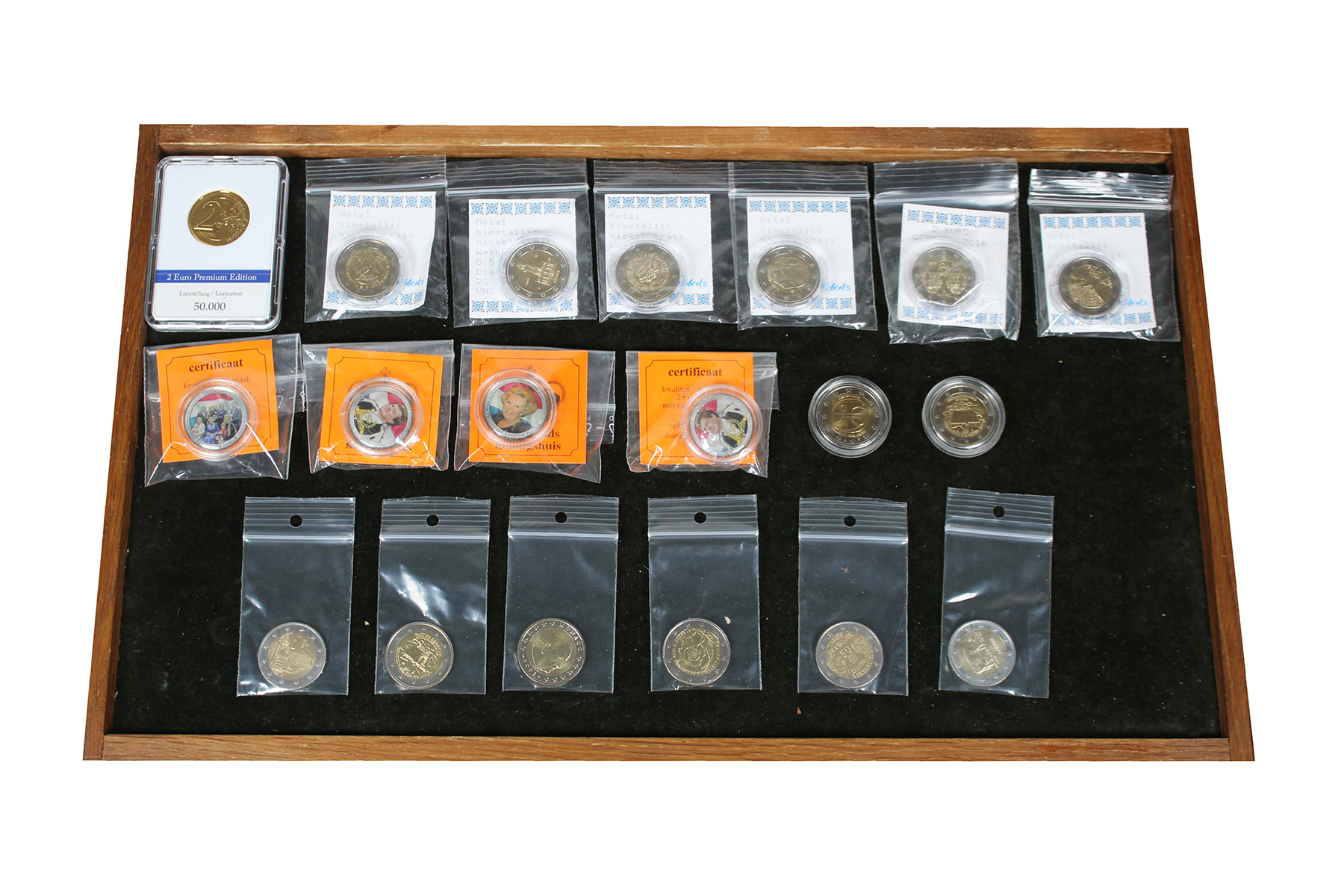 Bakje (19) € 2 herdenkingsmunten div. landen, w.o. gekleurde.