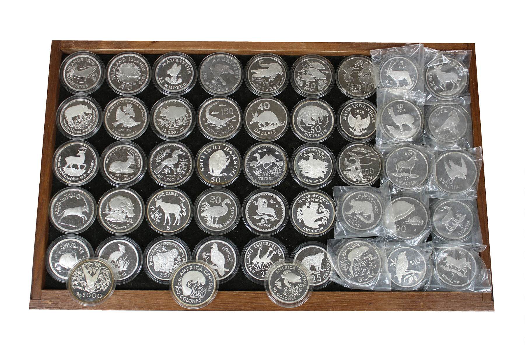 Doosje WWLF-munten (48) 1974-1979, los in capsules. Heel veel exotische dieren.Allen zilver proof. Netto zilver: 1407 gram.