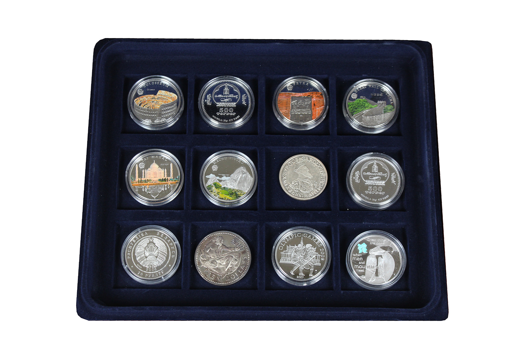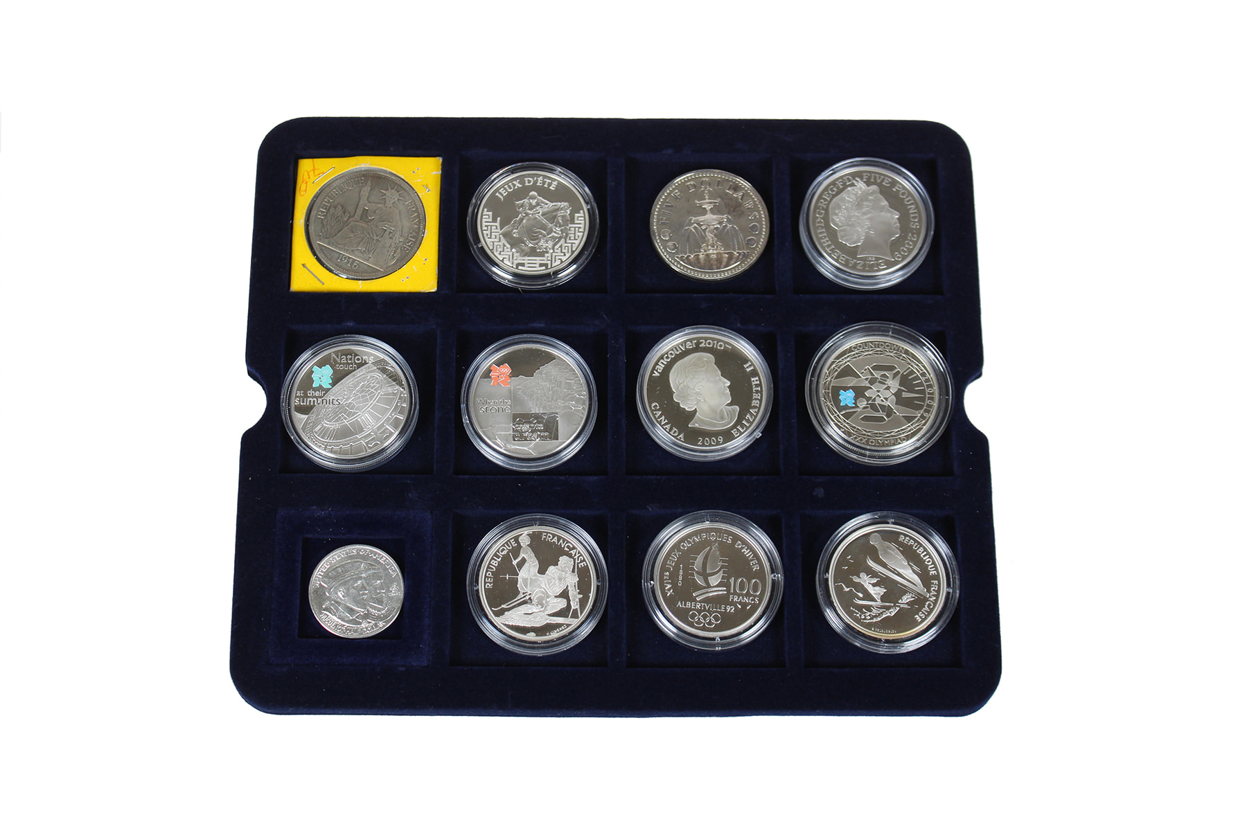 Luxe kist met 24 stuks vnl crown-size silver coins. Most proof.