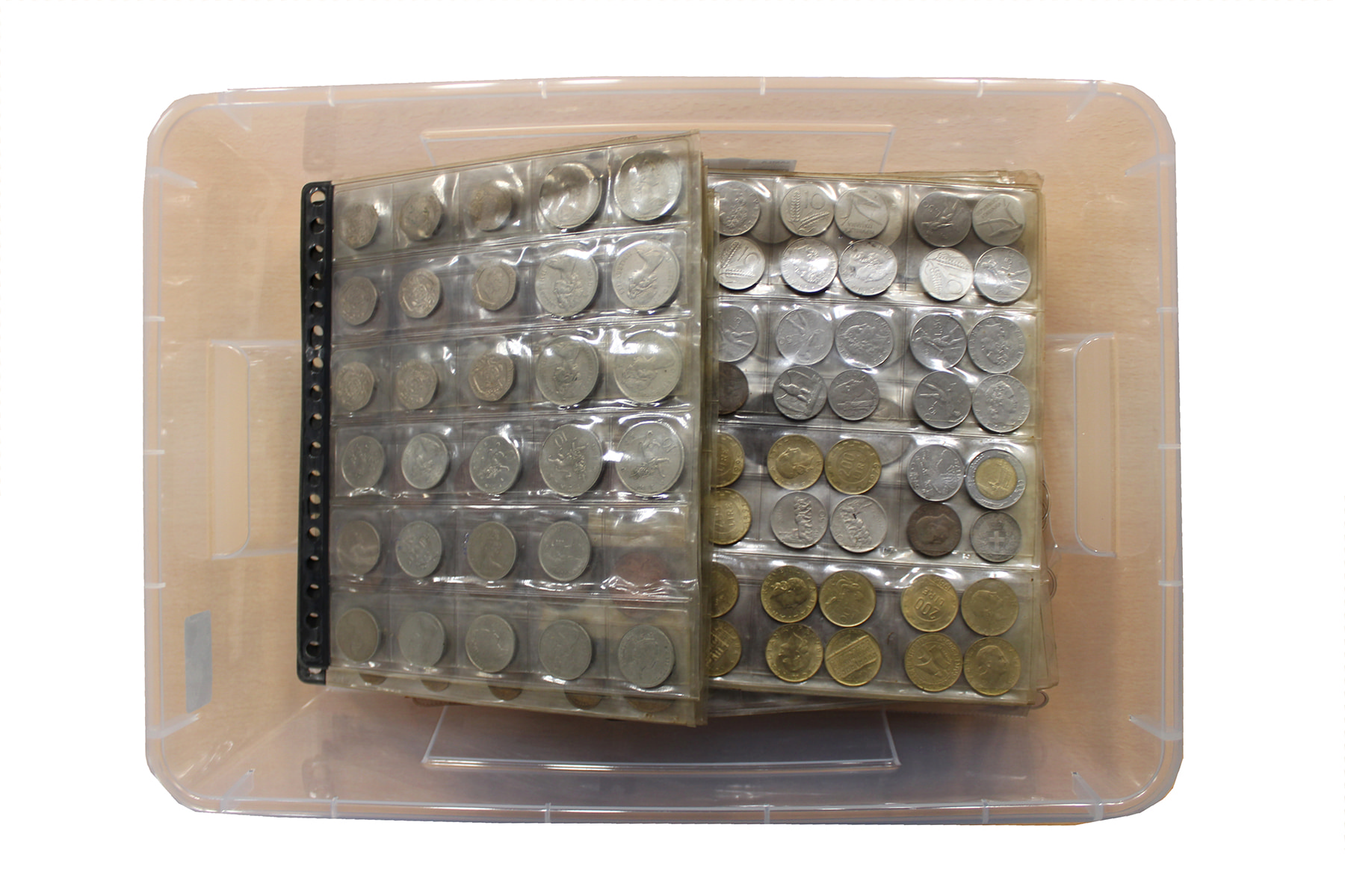 Bak wereldmunten in munthouders. Geen zilver en weinig spannends. Ca. 8 kg.
