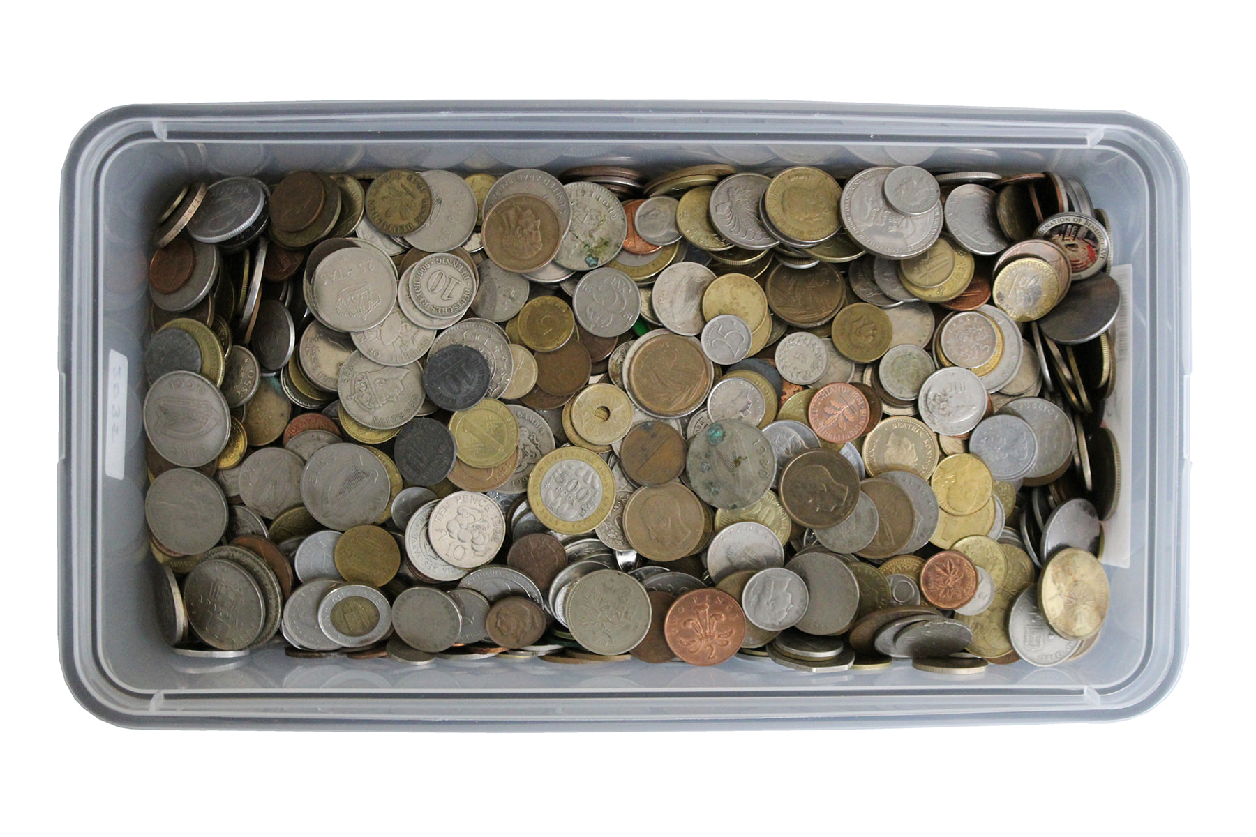 Plastic box eenvoudige wereldmunten, 10 kg., “kilowaar”.