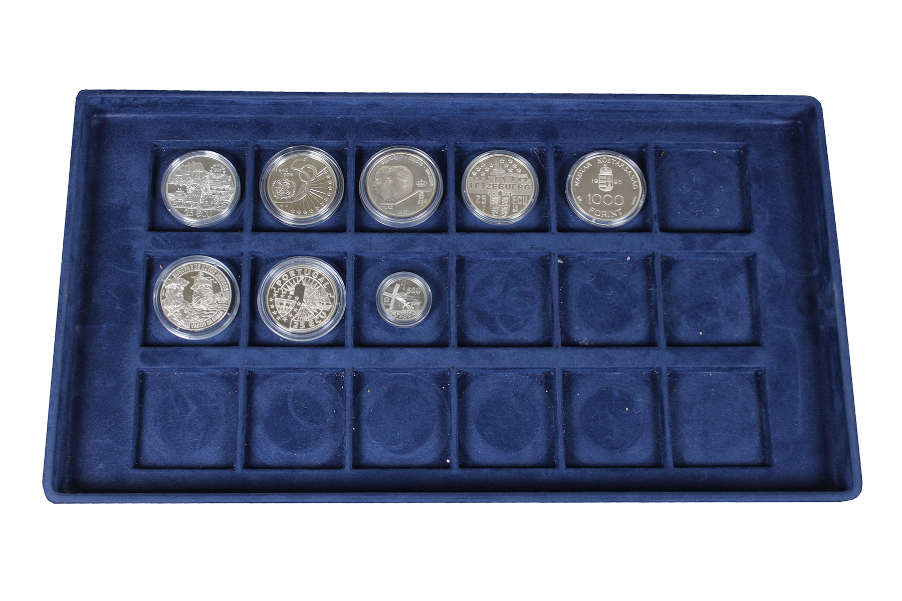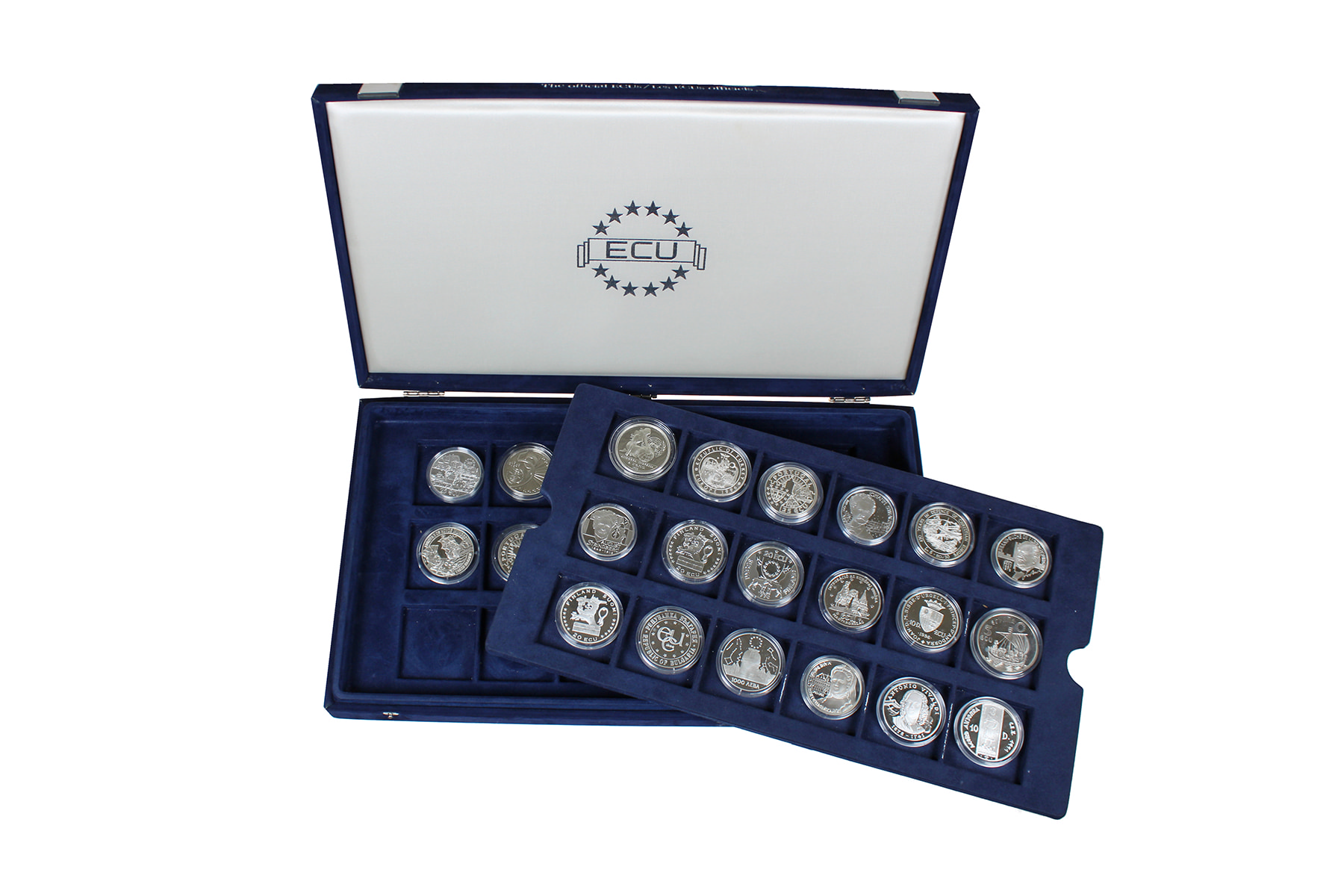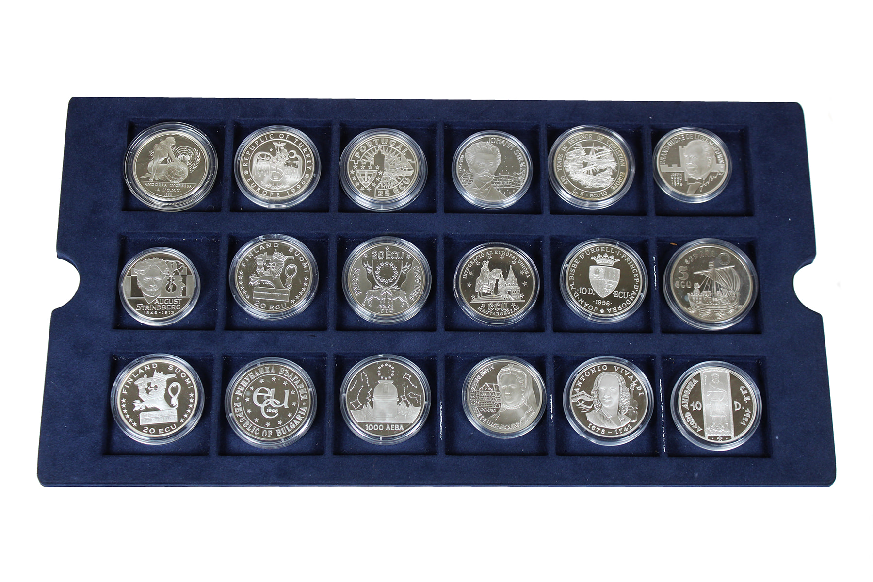 Luxe cassette met 26 stuks voornamelijk voorlopers op de euro, sterling zilver, ca. 680 gram. Gehalte 925/1000. Overwegend proof.