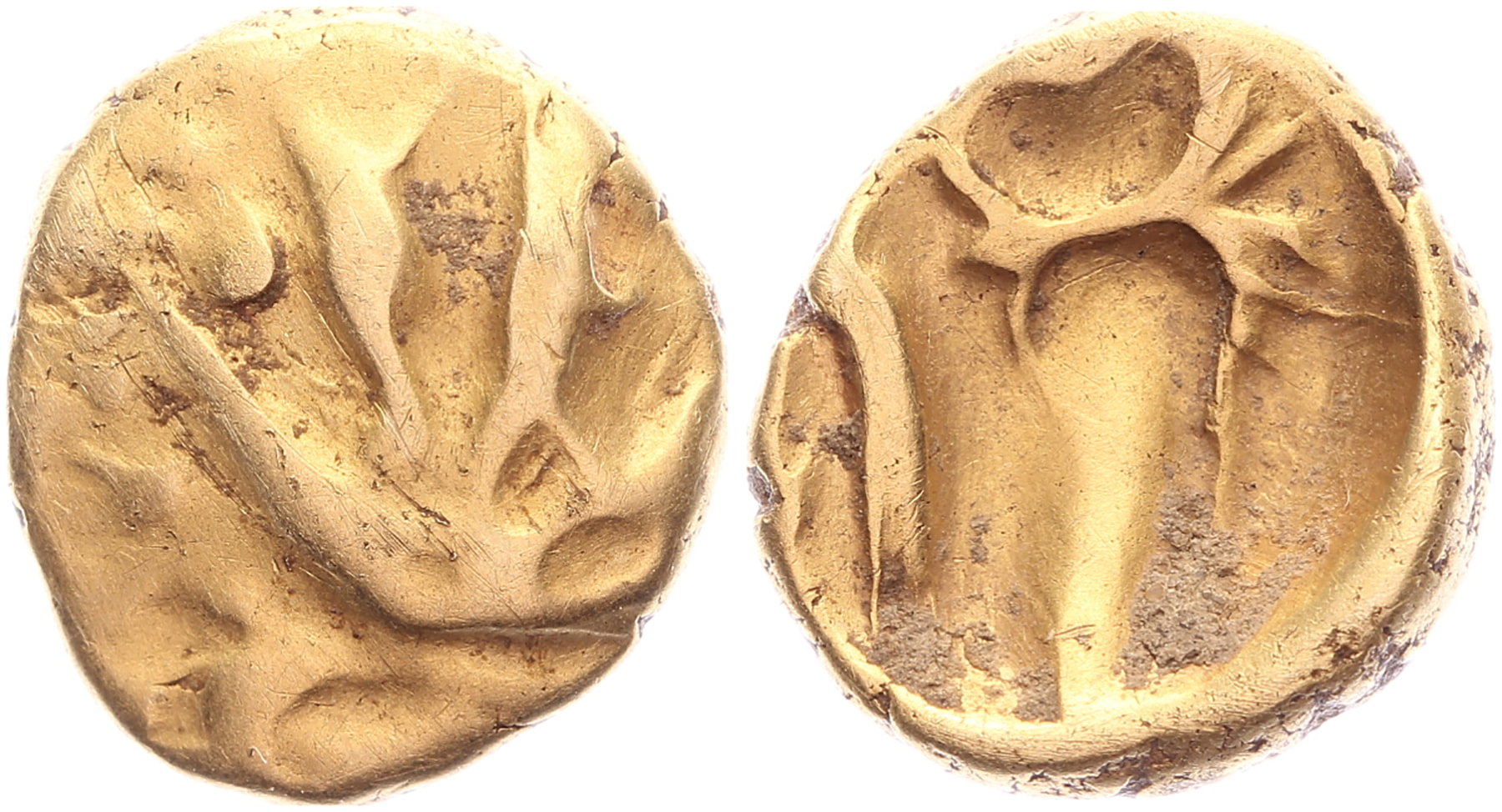 AV ‘Boat tree’ ¼ Stater ca. 70-50 BC [10 mm; 1,48 gm]. Stylised boat / tree intersecting line. Imported and frequently found in Britain. Van Arsdell 69, DT 249. F/VF.