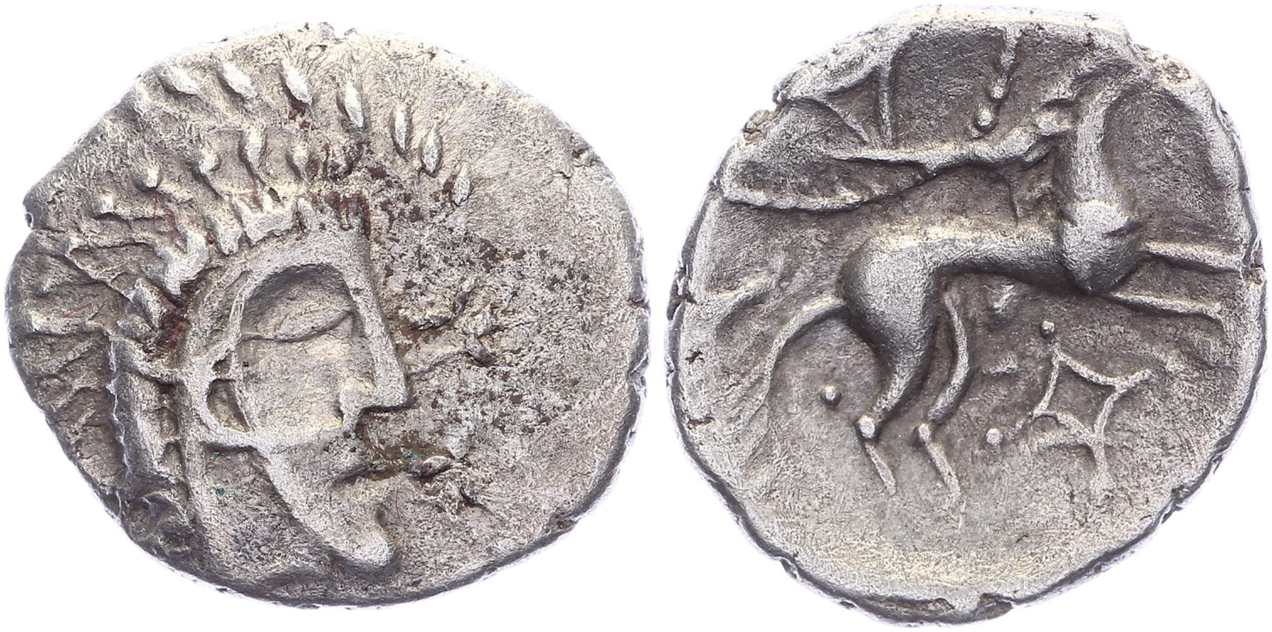20 BC-10 AD. AR Unit [14,08 mm; 1,16 gm]. ‘Norfolk God’ type. Stylised head right, trefoil in front, wreath behind / Horse right, triangular shape within pelleted arc above, lozenge-shaped box below. BMC 3556; Van Arsdell 790. VF.