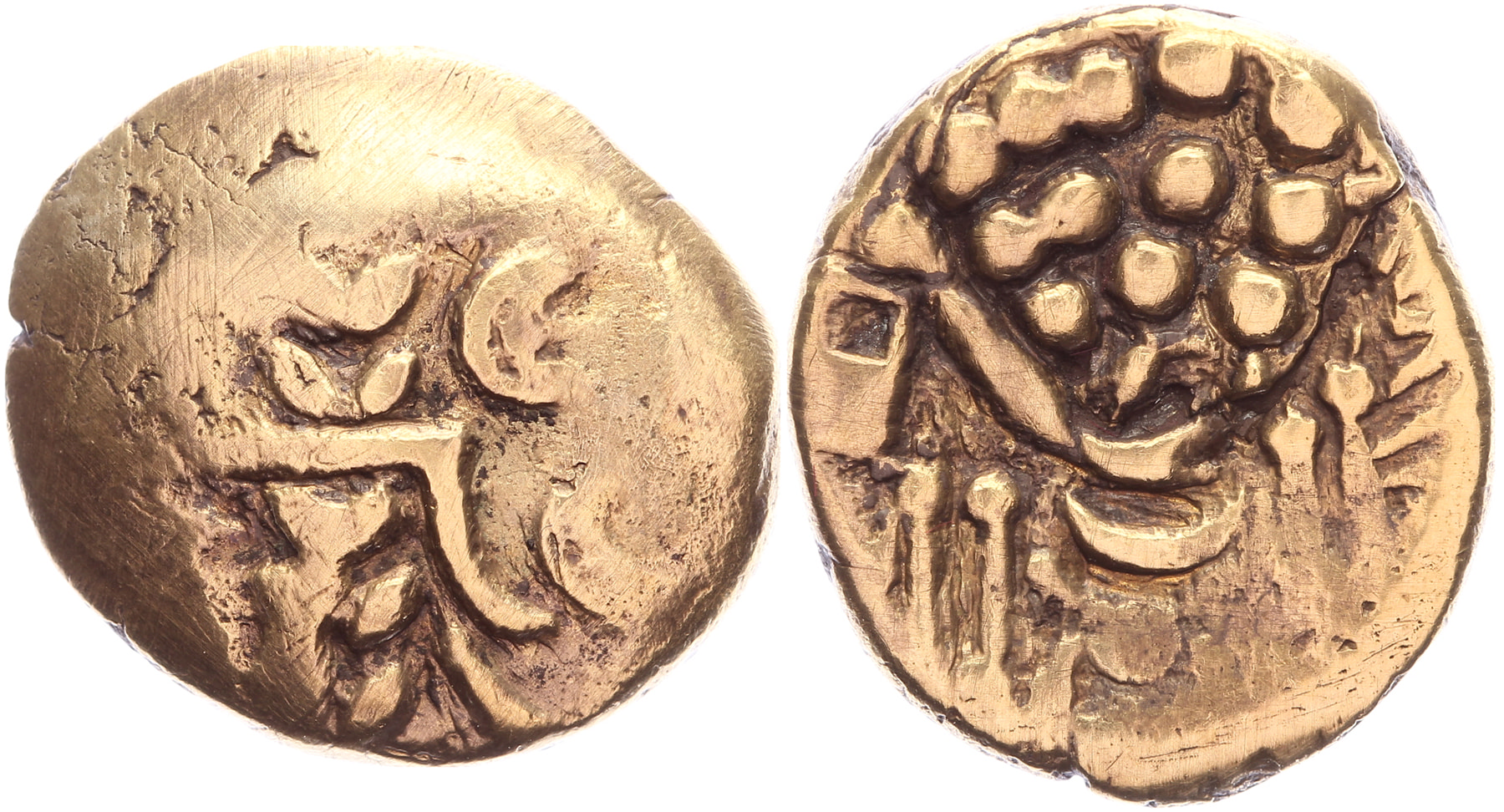 Circa 60-20 BC. AV Stater [18,45 mm; 3,87 gm]. Chute (Durotrigan A/British B) type. Wreath pattern with crescents / Disjointed horse left; ‘crab’ below; above tail, elongated pellet within elliptical ornament, row of pellets, three tiny dots in line below; pellets around. ABC 746. SCBC 22. Van Arsdell 1205-7 (Durotriges). Some cleaning scratches, VF.