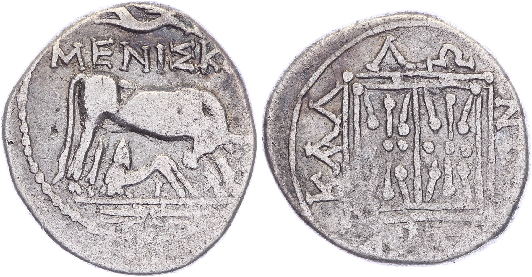 Lot (2) Circa 229-100 BC. AR Drachm [18,12 mm; 3,19 gm]. Perigenes and Kleitorios. Cow standing right, tripod in right field / Double stellate pattern. BMC 86-88. Toned VF; AR Drachm [16,57 mm; 3,22 gm]. Meniskos and Kallonos. Cow standing right, suckling calf. / Double stellate pattern within linear borders. Maier 256. Toned VF.
