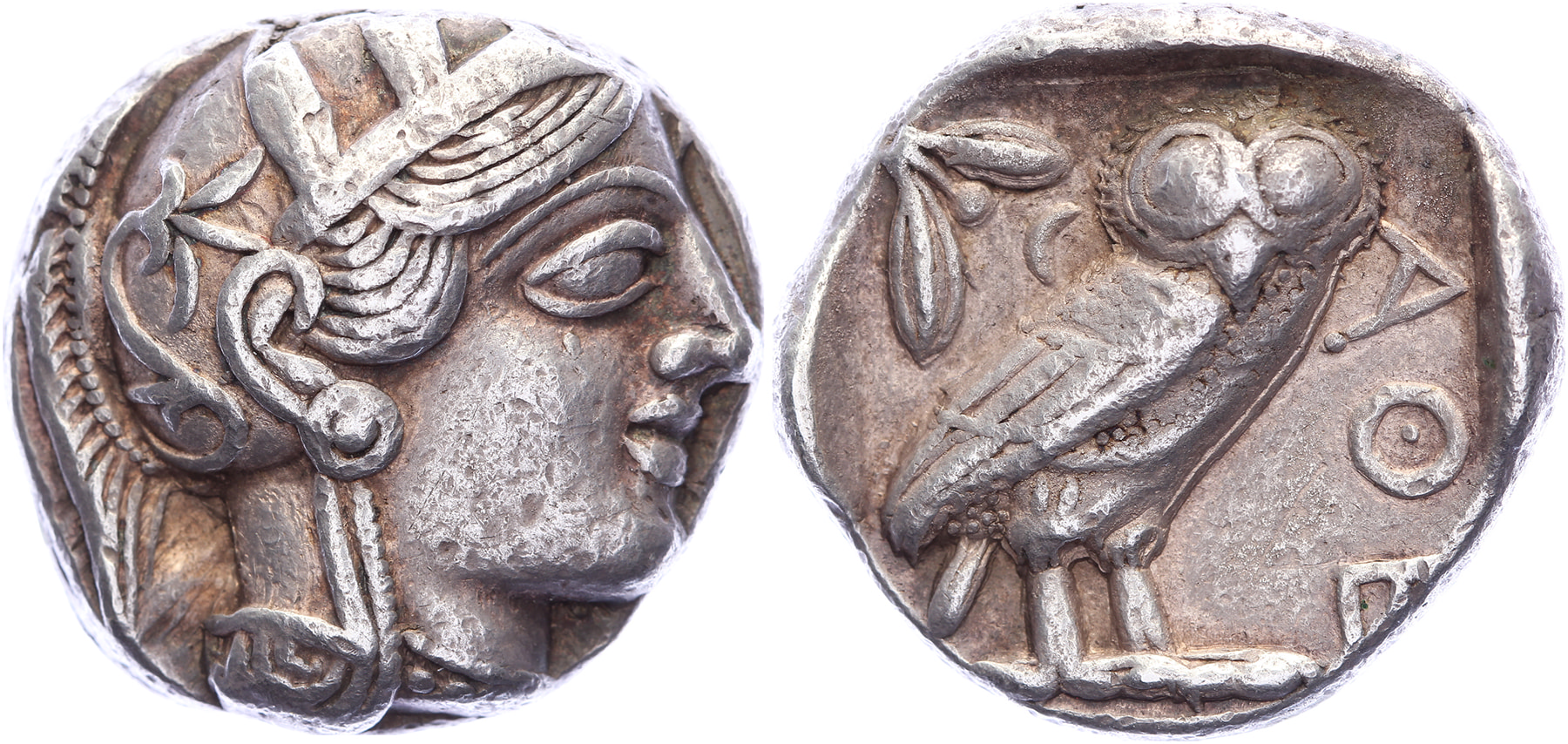 AR Tetradrachm, ca. 454-404 BC. [23,60 mm; 17,16 gm]. Helmeted head of Athena to right / AΘE, owl standing right, head facing, olive sprig and crescent behind. SNG Copenhagen 31. Toned nice VF.