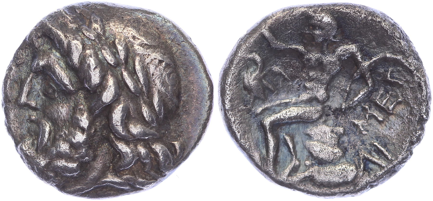 Circa 195-188 BC. AR Triobol [14,65 mm; 2,12 gm]. Laureate head of Zeus to left / ΜΕΓ Pan seated left on rock, his right hand raised and holding lagobolon with his left; above knee, eagle; to left, monogram of [ΚΑB]. BCD Peloponnesos 1558.2; Dengate 7. A bit rough, toned VF.