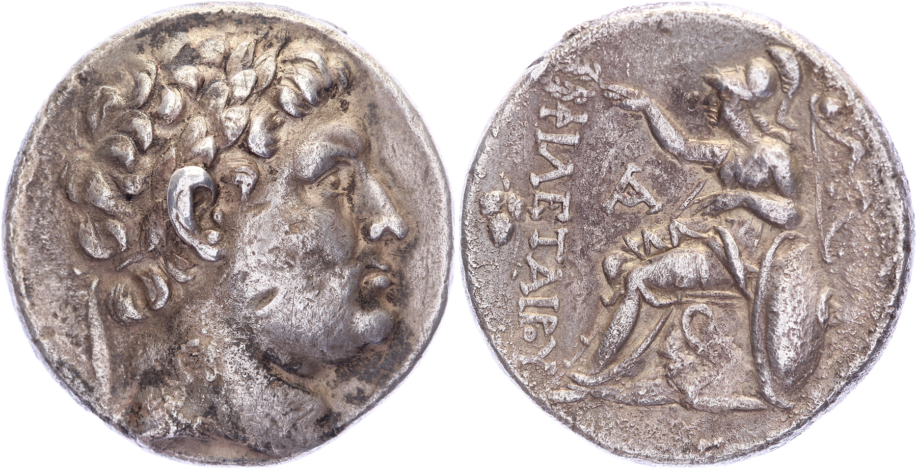 AR Tetradrachm [27,76 mm; 16,73 gm]. Laureate head of Philetaeros right /  ΦIΛETAIPOY, Athena seated left on throne, crowning king’s name with her raised right hand, her left arm resting on large shield decorated with Gorgoneion, spear reclining against her right shoulder; in field left grapes, in centre A; to right, bow. Westermark V.LXXV-R.2; SNG BN 1616-1620. Some marks and minor dark deposits, VF.