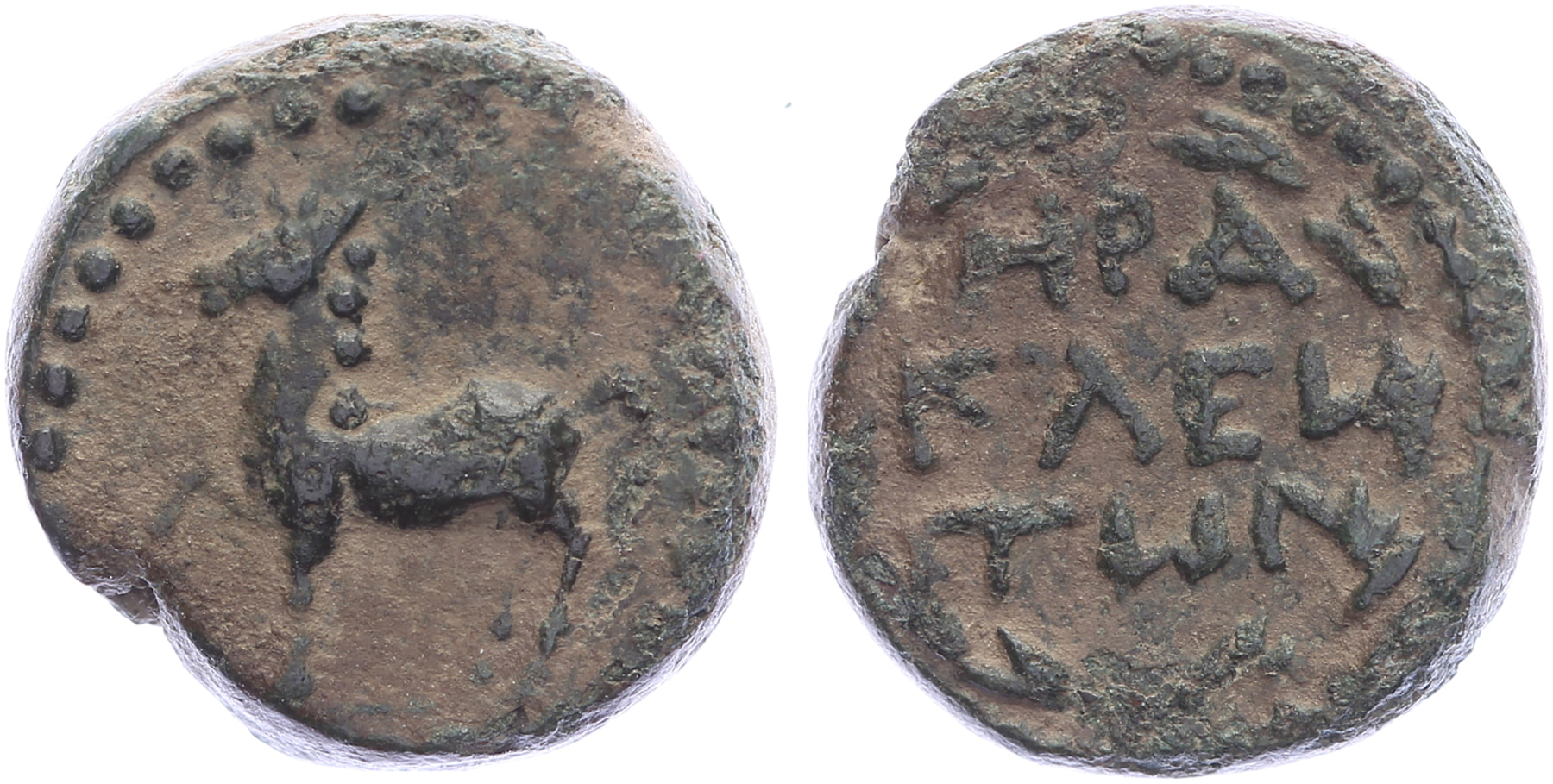AE [12,98 mm; 2,85 gm]. Horse standing to left, with foreleg raised; all within dotted border / HPAKΛEWTWN in three lines within laurel wreath. Imhoof-Blumer, RPC 667C = Roma E-73, 242 (horse to left). Extremely Rare. VF.