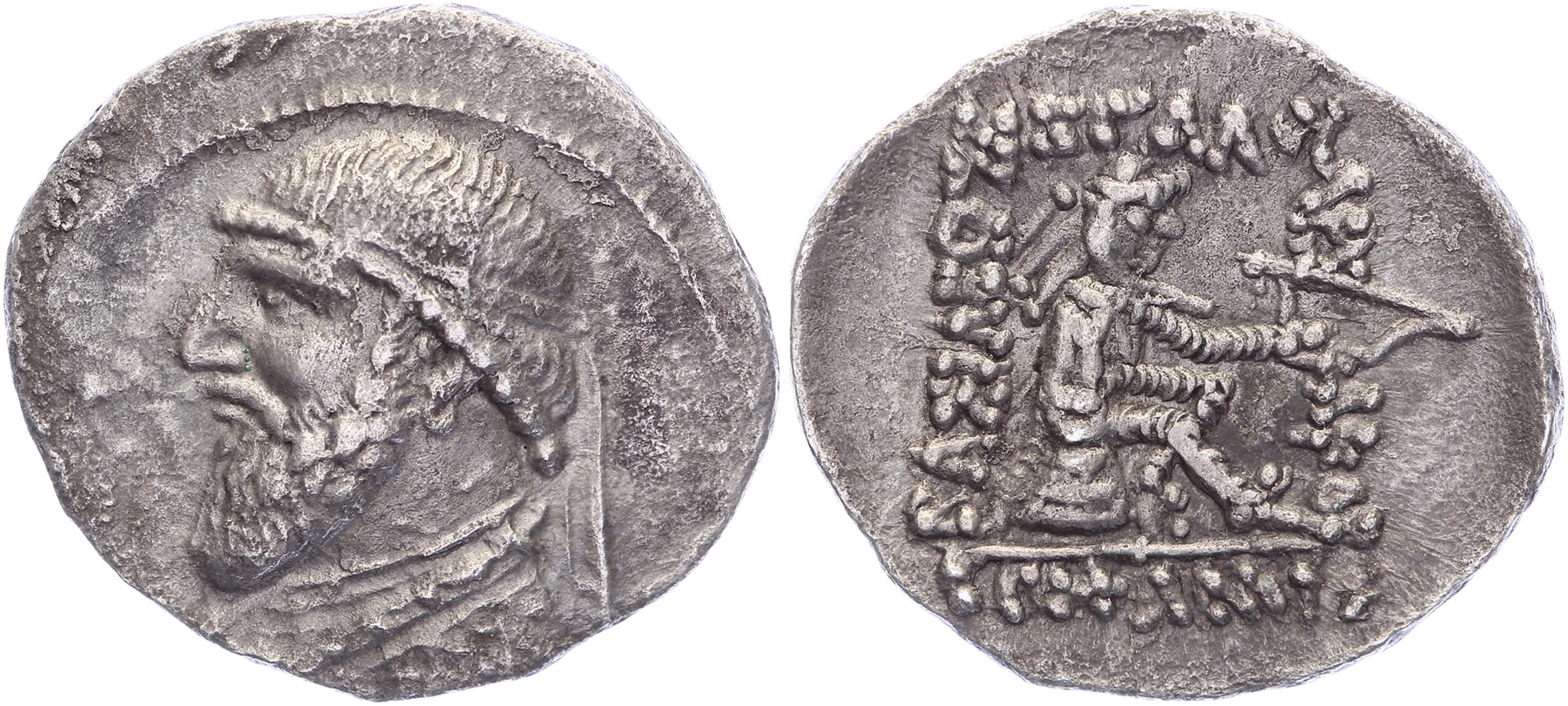 AR Drachm [21,42 mm; 3,20 gm]. Diademed and draped bust left / ΒΑΣΙΛΕΩΣ - ΜΕΓΑΛΟΥ - ΑΡΣΑΚΟΥ / ΕΠΙΦΑΝΟΥΣ, Arsakes I seated right on throne, holding bow. Sellwood 24/7. Porosity, toned VF.