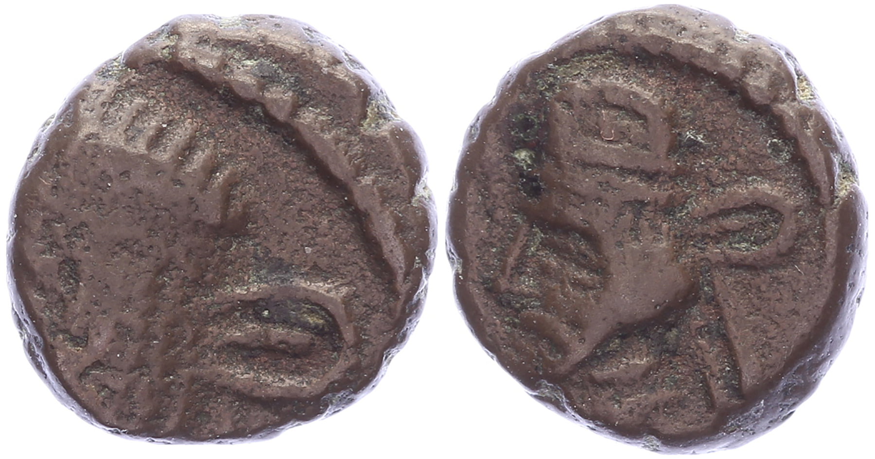 AR Drachm [20,37 mm; 3,70 gm]. Ecbatana mint. Bust left with long pointed beard, wearing double banded diadem with double loop, spiral torque, earring visible, dotted border / BAΣIΛEΩΣ / BAΣIΛEΩN-AΡ-ΣANOΥ-EΥEΡΓETOΥ / ΔIXAIOΥ-EΠIΦANOΥΣ / ΦIΛEΛΛHXOΣ, archer (Arsaces I) enthroned right, in Parthian dress, with bow in outstretched right hand. Sunrise 412. Sellwood 63.6 (Artabanus II).  Toned gVF.Added: AE Chalkous [9,71 mm; 1,10 gm]. Ekbatana mint. Diademed head left / Bust left, wearing tiara. Sellwood 63.18 (Artabanus II). Off centre obverse, gF.