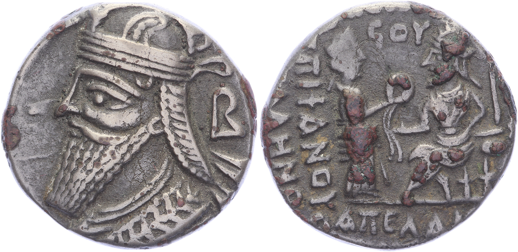 AR Tetradrachm [25,27 mm; 10,63 gm]. Seleukeia on the Tigris mint. Dated Seleucid Era Apellaiou, 476 (November, 167 AD). Diademed bust left, wearing tiara, with tapering beard; Β to right / Vologases seated left on throne, receiving diadem from Tyche standing right and holding scepter; A(koppa)V (year) above, ΑΠΕΛΑ[ΙΟΥ] (month) below. Sellwood 84.31. Small dark deposits on both sides, VF.