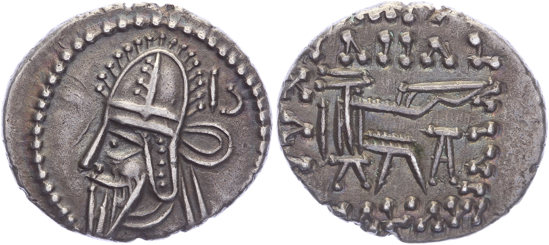 AR Drachm [19,26 mm; 3,55 gm]. Ekbatana mint. Diademed and draped bust of Vologases VI to left, wearing tiara; to right, ‘wl’ in Aramaic / Corrupted Greek legend, Archer (Arsakes I) seated right on throne, holding bow; below bow, monogram. Sellwood 88.18. Shore 456. Toned gVF.